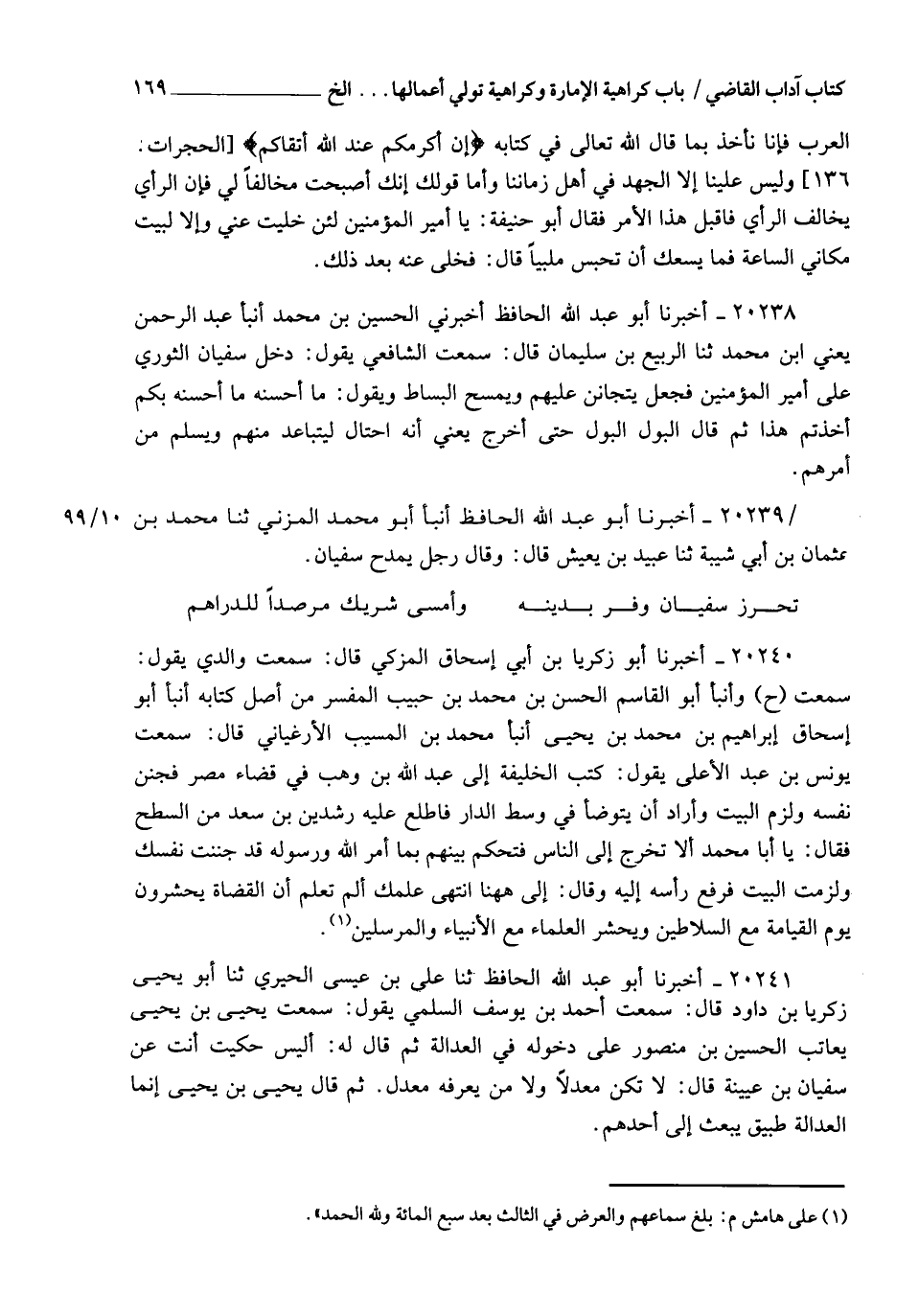 20240 - أَخْبَرَنَا أَبُو زَكَرِيَّا بْنُ أَبِي إِسْحَاقَ الْمُزَكِّي , قَالَ سَمِعْتُ وَالِدِي , يَقُولُ: سَمِعْتُ، ح، وَأنبأ أَبُو الْقَاسِمِ الْحَسَنُ بْنُ مُحَمَّدِ بْنِ حَبِيبٍ الْمُفَسِّرُ , مِنْ أَصْلِ كِتَابِهِ أنبأ أَبُو إِسْحَاقَ إِبْرَاهِيمُ بْنُ مُحَمَّدِ بْنِ يَحْيَى , أنبأ مُحَمَّدُ بْنُ الْمُسَيِّبِ الْأَرْغِيَانِيُّ، قَالَ سَمِعْتُ يُونُسَ بْنَ عَبْدِ الْأَعْلَى يَقُولُ: " كَتَبَ الْخَلِيفَةُ إِلَى عَبْدِ اللهِ بْنِ وَهْبٍ فِي قَضَاءِ مِصْرَ فَجَنَّنَ نَفْسَهُ , وَلَزِمَ الْبَيْتَ , وَأَرَادَ أَنْ يَتَوَضَّأَ فِي وَسَطِ الدَّارِ , فَاطَّلَعَ عَلَيْهِ رِشْدِينُ بْنُ سَعْدٍ مِنَ السَّطْحِ , فَقَالَ: " يَا أَبَا مُحَمَّدٍ أَلَا تَخْرُجُ إِلَى النَّاسِ , فَتَحْكُمَ بَيْنَهُمْ بِمَا أَمَرَ اللهُ وَرَسُولُهُ؟ قَدْ جَنَّنْتَ نَفْسَكَ , وَلَزِمْتَ الْبَيْتَ " , فَرَفَعَ رَأْسَهُ إِلَيْهِ , وَقَالَ: " إِلَى هَهُنَا انْتَهَى عِلْمُكَ؟ §أَلَمْ تَعْلَمْ أَنَّ الْقُضَاةَ يُحْشَرُونَ يَوْمَ الْقِيَامَةِ مَعَ السَّلَاطِينَ , وَيُحْشَرُ الْعُلَمَاءُ مَعَ الْأَنْبِيَاءِ وَالْمُرْسَلِينَ؟ "