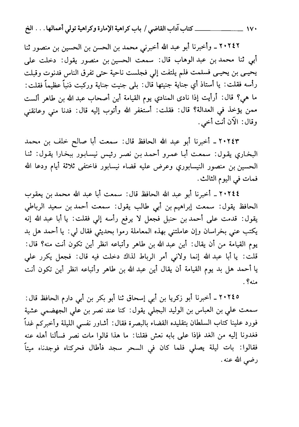 20243 - أَخْبَرَنَا أَبُو عَبْدِ اللهِ الْحَافِظُ , قَالَ: سَمِعْتُ أَبَا صَالِحٍ خَلَفَ بْنَ مُحَمَّدٍ الْبُخَارِيَّ يَقُولُ: سَمِعْتُ أَبَا عَمْرٍو أَحْمَدَ بْنَ نَصْرٍ رَئِيسَ نَيْسَابُورَ بِبُخَارَى يَقُولُ: ثنا الْحُسَيْنُ بْنُ مَنْصُورٍ النَّيْسَابُورِيُّ , §وَعُرِضَ عَلَيْهِ قَضَاءُ نَيْسَابُورَ فَاخْتَفَى ثَلَاثَةَ أَيَّامٍ , وَدَعَا اللهَ فَمَاتَ فِي الْيَوْمِ الثَّالِثِ