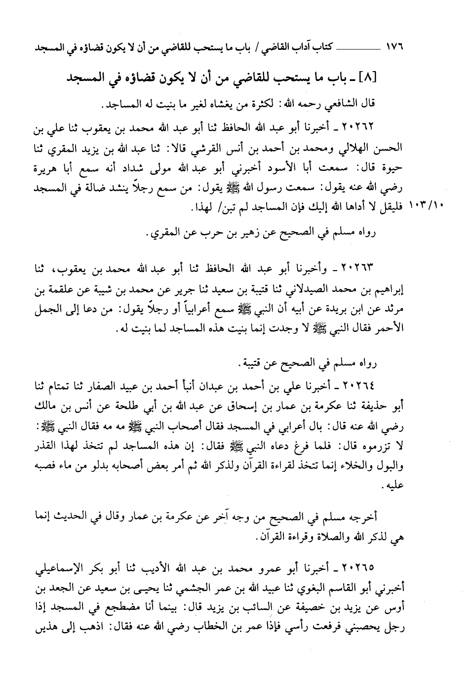 20264 - أَخْبَرَنَا عَلِيُّ بْنُ أَحْمَدَ بْنِ عَبْدَانَ , أنبأ أَحْمَدُ بْنُ عُبَيْدٍ الصَّفَّارُ , ثنا تَمْتَامٌ , ثنا أَبُو حُذَيْفَةَ , ثنا عِكْرِمَةُ بْنُ عَمَّارِ , عَنْ إِسْحَاقَ بْنِ عَبْدِ اللهِ بْنِ أَبِي طَلْحَةَ , عَنْ أَنَسِ بْنِ مَالِكٍ , رَضِيَ اللهُ عَنْهُ قَالَ: بَالَ أَعْرَابِيٌّ فِي الْمَسْجِدِ , فَقَالَ أَصْحَابُ النَّبِيِّ صَلَّى اللهُ عَلَيْهِ وَسَلَّمَ: مَهْ مَهْ، فَقَالَ النَّبِيُّ صَلَّى اللهُ عَلَيْهِ وَسَلَّمَ: " لَا تُزْرِمُوهُ " , قَالَ: فَلَمَّا فَرَغَ , دَعَاهُ النَّبِيُّ صَلَّى اللهُ عَلَيْهِ وَسَلَّمَ , فَقَالَ: §" إِنَّ هَذِهِ الْمَسَاجِدَ لَمْ تُتَّخَذْ لِهَذَا الْقَذَرِ وَالْبَوْلِ وَالْخَلَاءِ إِنَّمَا تُتَّخَذُ لِقِرَاءَةِ الْقُرْآنِ , وَلِذِكْرِ اللهِ " , ثُمَّ أَمَرَ بَعْضَ أَصْحَابِهِ بِدَلْوٍ مِنْ مَاءٍ , فَصَبَّهُ عَلَيْهِ. أَخْرَجَهُ مُسْلِمٌ فِي الصَّحِيحِ مِنْ وَجْهٍ آخَرَ عَنْ عِكْرِمَةَ بْنِ عَمَّارٍ وَقَالَ فِي الْحَدِيثِ: " إِنَّمَا هِيَ لِذِكْرِ اللهِ , وَالصَّلَاةِ , وَقِرَاءَةِ الْقُرْآنِ "