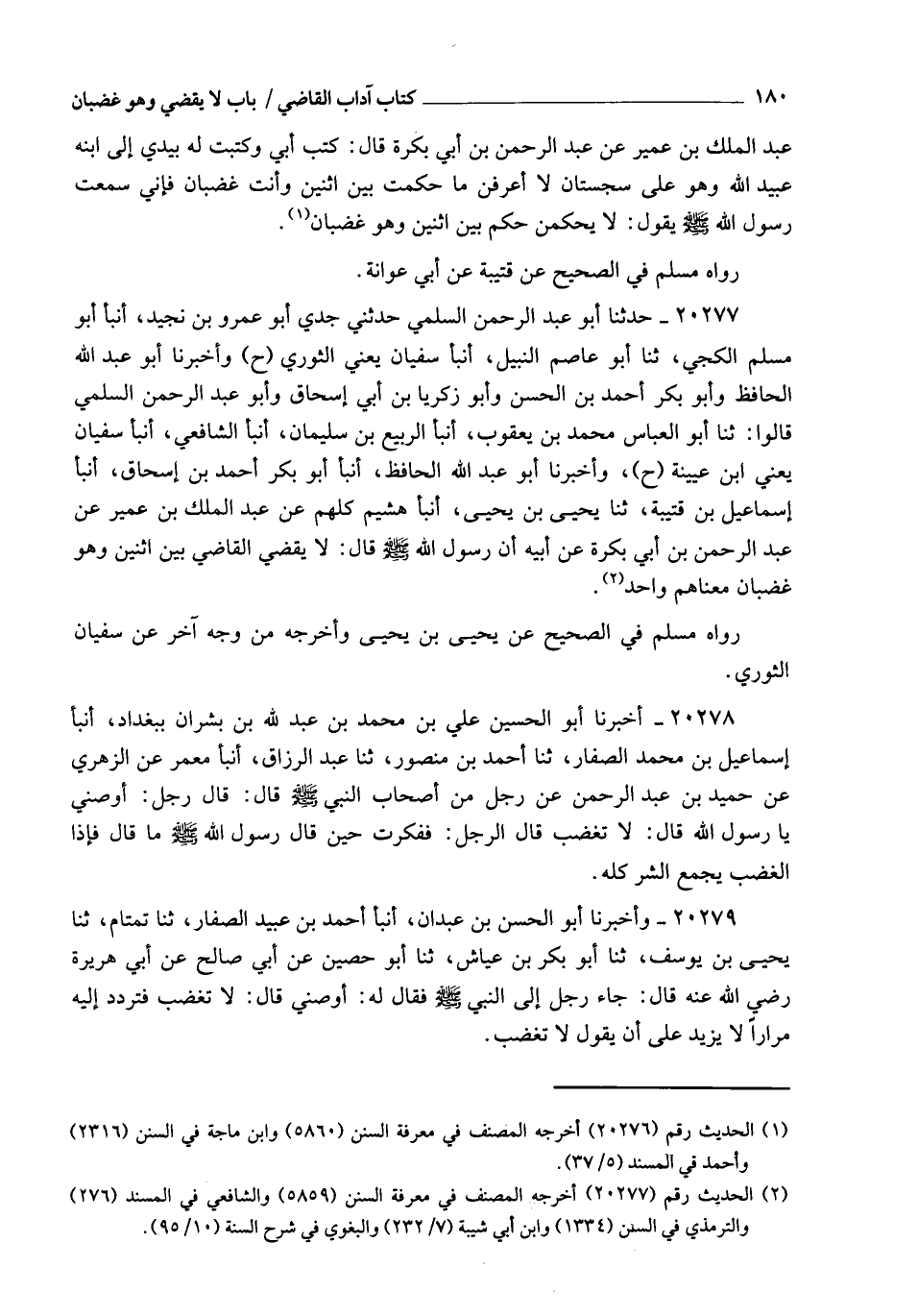 20277 - حَدَّثَنَا أَبُو عَبْدِ الرَّحْمَنِ السُّلَمِيُّ , حَدَّثَنِي جَدِّي أَبُو عَمْرِو بْنُ نُجَيْدٍ , أنبأ أَبُو مُسْلِمٍ الْكَجِّيُّ , ثنا أَبُو عَاصِمٍ النَّبِيلُ , أنبأ سُفْيَانُ: يَعْنِي الثَّوْرِيَّ ح , وَأَخْبَرَنَا أَبُو عَبْدِ اللهِ الْحَافِظُ , وَأَبُو بَكْرٍ أَحْمَدُ بْنُ الْحَسَنِ وَأَبُو زَكَرِيَّا بْنُ أَبِي إِسْحَاقَ وَأَبُو عَبْدِ الرَّحْمَنِ السُّلَمِيُّ قَالُوا: ثنا أَبُو الْعَبَّاسِ مُحَمَّدُ بْنُ يَعْقُوبَ، أنبأ الرَّبِيعُ بْنُ سُلَيْمَانَ , أنبأ الشَّافِعِيُّ , أنبأ سُفْيَانُ: يَعْنِي ابْنَ عُيَيْنَةَ، ح، وَأَخْبَرَنَا أَبُو عَبْدِ اللهِ الْحَافِظُ , أنبأ أَبُو بَكْرٍ أَحْمَدُ بْنُ إِسْحَاقَ، أنبأ إِسْمَاعِيلُ بْنُ قُتَيْبَةَ , ثنا يَحْيَى بْنُ يَحْيَى , أنبأ هُشَيْمٌ , كُلُّهُمْ , عَنْ عَبْدِ الْمَلِكِ بْنِ عُمَيْرٍ , عَنْ عَبْدِ الرَّحْمَنِ بْنِ أَبِي بَكْرَةَ , عَنْ أَبِيهِ , أَنَّ رَسُولَ اللهِ صَلَّى اللهُ عَلَيْهِ وَسَلَّمَ قَالَ: §" لَا يَقْضِي الْقَاضِي بَيْنَ اثْنَيْنِ وَهُوَ غَضْبَانُ ". مَعْنَاهُمْ وَاحِدٌ , رَوَاهُ مُسْلِمٌ فِي الصَّحِيحِ , عَنْ يَحْيَى بْنِ يَحْيَى وَأَخْرَجَهُ مِنْ وَجْهٍ آخَرَ , عَنْ سُفْيَانَ الثَّوْرِيِّ.