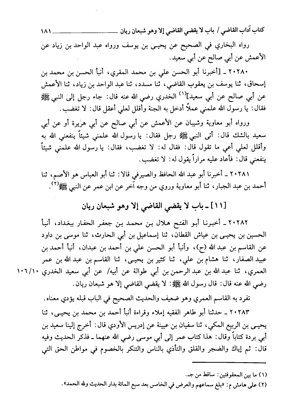 20282 - أَخْبَرَنَا أَبُو الْفَتْحِ هِلَالُ بْنُ مُحَمَّدِ بْنِ جَعْفَرٍ الْحَفَّارُ بِبَغْدَادَ، أنبأ الْحُسَيْنُ بْنُ يَحْيَى بْنِ عَيَّاشٍ الْقَطَّانُ , ثنا إِسْمَاعِيلُ بْنُ أَبِي الْحَارِثِ , ثنا مُوسَى بْنُ دَاوُدَ , عَنِ الْقَاسِمِ بْنِ عَبْدِ اللهِ ح وَأنبأ أَبُو الْحَسَنِ عَلِيُّ بْنُ أَحْمَدَ بْنِ عَبْدَانَ، أنبأ أَحْمَدُ بْنُ عُبَيْدٍ الصَّفَّارُ , ثنا هِشَامُ بْنُ عَلِيٍّ , ثنا كَثِيرُ بْنُ يَحْيَى , ثنا الْقَاسِمُ بْنُ عَبْدِ اللهِ بْنِ عُمَرَ الْعُمَرِيُّ , ثنا عَبْدُ اللهِ بْنُ عَبْدِ الرَّحْمَنِ أَبُو طُوَالَةَ , عَنْ أَبِيهِ , عَنْ أَبِي سَعِيدِ الْخُدْرِيِّ , رَضِيَ اللهُ عَنْهُ قَالَ: قَالَ رَسُولُ اللهِ صَلَّى اللهُ عَلَيْهِ وَسَلَّمَ: §" لَا يَقْضِي الْقَاضِي إِلَّا هُوَ شَبْعَانُ رَيَّانُ ". تَفَرَّدَ بِهِ الْقَاسِمُ الْعُمَرِيُّ وَهُوَ ضَعِيفٌ وَالْحَدِيثُ الصَّحِيحُ فِي الْبَابِ قَبْلَهُ يُؤَدِّي مَعْنَاهُ
