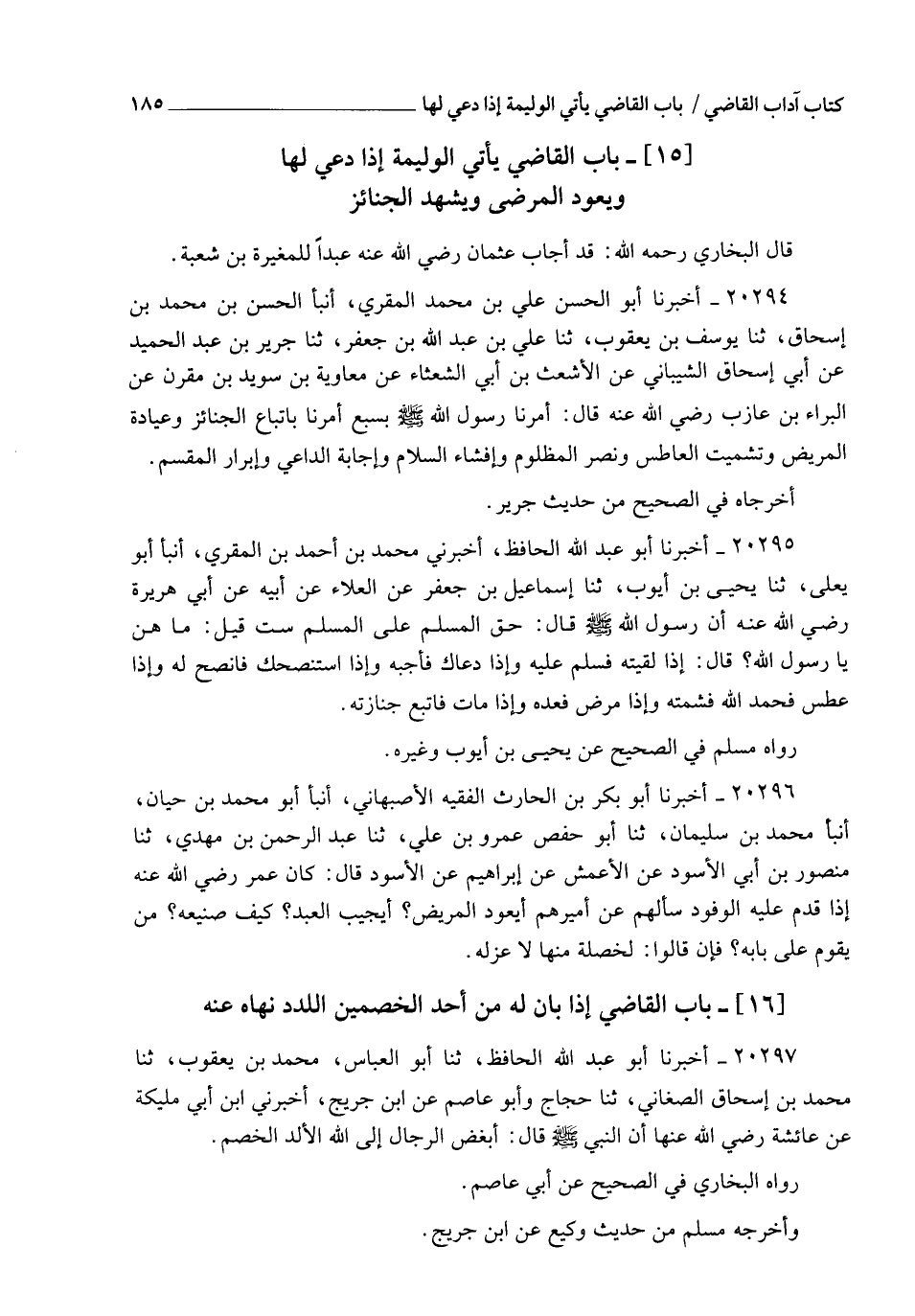 §بَابُ: الْقَاضِي يَأْتِي الْوَلِيمَةَ إِذَا دُعِيَ لَهَا, وَيَعُودُ الْمَرْضَى, وَيَشْهَدُ الْجَنَائِزَ