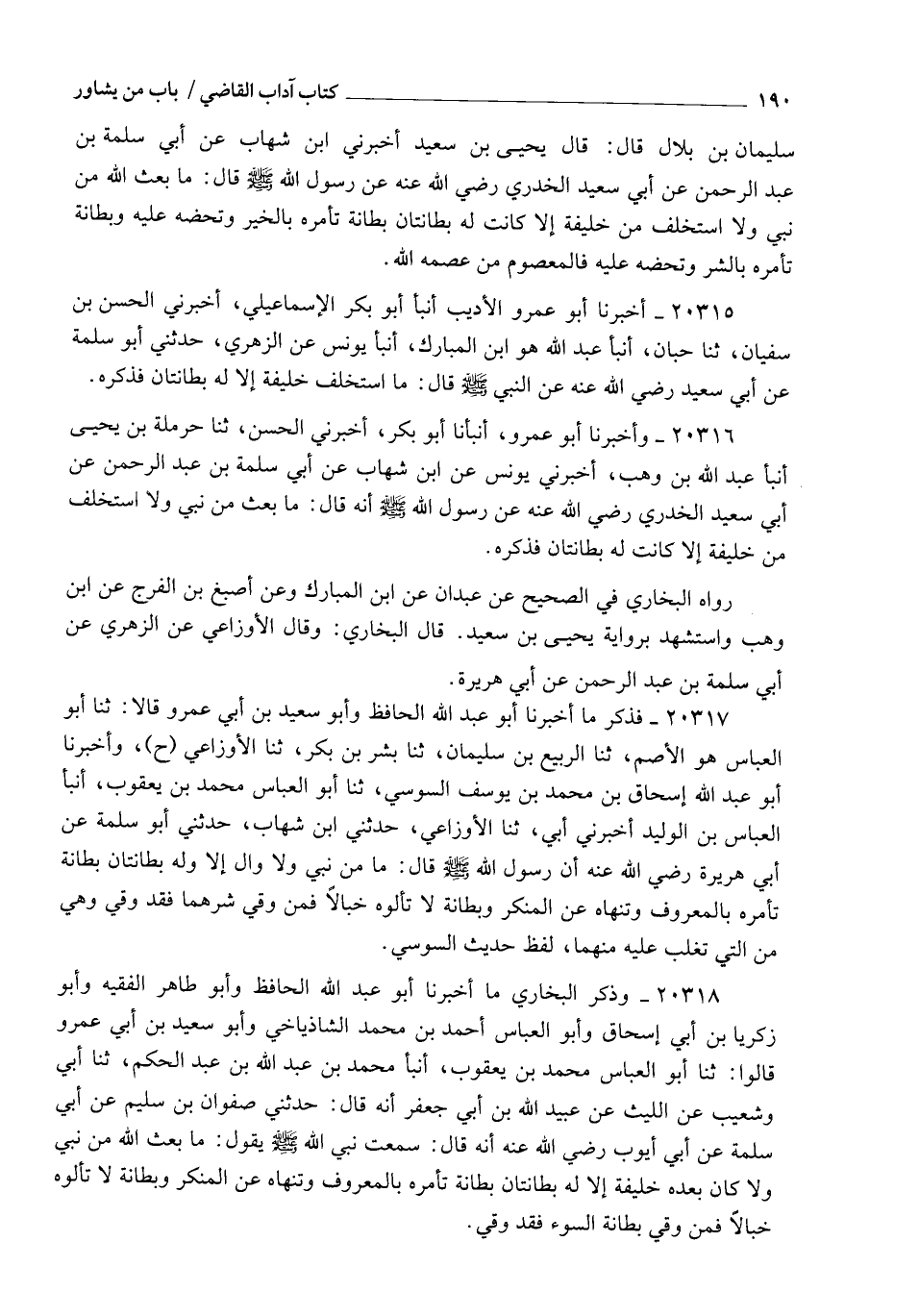 20317 - فَذَكَرَ مَا أَخْبَرَنَا أَبُو عَبْدِ اللهِ الْحَافِظُ , وَأَبُو سَعِيدِ بْنُ أَبِي عَمْرٍو قَالَا: ثنا أَبُو الْعَبَّاسِ هُوَ الْأَصَمُّ، ثنا الرَّبِيعُ بْنُ سُلَيْمَانَ , ثنا بِشْرُ بْنُ بَكْرٍ , ثنا الْأَوْزَاعِيُّ ح وَأَخْبَرَنَا أَبُو عَبْدِ اللهِ إِسْحَاقُ بْنُ مُحَمَّدِ بْنِ يُوسُفُ السُّوسِيُّ، ثنا أَبُو الْعَبَّاسِ مُحَمَّدُ بْنُ يَعْقُوبَ، أنبأ الْعَبَّاسُ بْنُ الْوَلِيدِ , أَخْبَرَنِي أَبِي , ثنا الْأَوْزَاعِيُّ , حَدَّثَنِي ابْنُ شِهَابٍ , حَدَّثَنِي أَبُو سَلَمَةَ , عَنْ أَبِي هُرَيْرَةَ، رَضِيَ اللهُ عَنْهُ: أَنَّ رَسُولَ اللهِ صَلَّى اللهُ عَلَيْهِ وَسَلَّمَ قَالَ: §" مَا مِنْ نَبِيٍّ وَلَا وَالٍ إِلَّا وَلَهُ بِطَانَتَانِ: بَطَانَةٌ تَأْمُرُهُ بِالْمَعْرُوفِ , وَتَنْهَاهُ عَنِ الْمُنْكَرِ وَبِطَانَةٌ لَا تَأْلُوهُ خَبَالًا فَمَنْ وُقِيَ شَرَّهُمَا فَقَدْ وُقِيَ وَهِيَ مَعَ الَّتِي تَغْلِبُ عَلَيْهِ مِنْهُمَا ". لَفْظُ حَدِيثِ السُّوسِيِّ