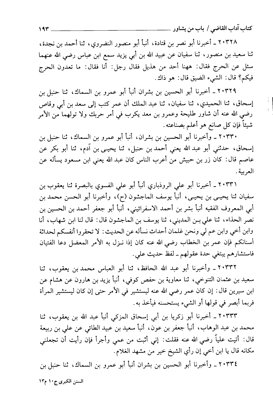 20332 - وَأَخْبَرَنَا أَبُو عَبْدِ اللهِ الْحَافِظُ , ثنا أَبُو الْعَبَّاسِ مُحَمَّدُ بْنُ يَعْقُوبَ، ثنا سَعِيدُ بْنُ عُثْمَانَ التَّنُوخِيُّ , ثنا مُعَاوِيَةُ بْنُ حَفْصٍ الْكُوفِيُّ , أنبأ يَزِيدُ بْنُ هَارُونَ , عَنْ هِشَامٍ , عنِ ابنِ سِيرِينَ، قَالَ: §إِنْ كَانَ عُمَرُ رَضِيَ اللهُ عَنْهُ لَيَسْتَشِيرُ فِي الْأَمْرِ , حَتَّى إِنْ كَانَ لَيَسْتَشِيرُ الْمَرْأَةَ , فَرُبَّمَا أَبْصَرَ فِي قَوْلِهَا , أَوِ الشَّيْءَ يَسْتَحْسِنُهُ , فَيَأْخُذُ بِهِ "