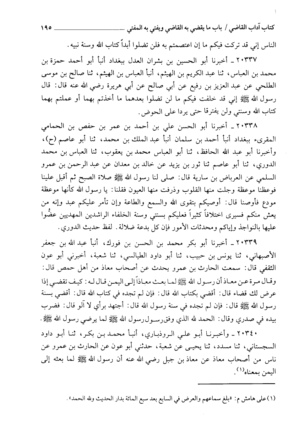 20339 - أَخْبَرَنَا أَبُو بَكْرٍ مُحَمَّدُ بْنُ الْحَسَنِ بْنِ فُورَكٍ، أنبأ عَبْدُ اللهِ بْنُ جَعْفَرٍ الْأَصْبَهَانِيُّ , ثنا يُونُسُ بْنُ حَبِيبٍ , ثنا أَبُو دَاوُدَ الطَّيَالِسِيُّ , ثنا شُعْبَةُ , أَخْبَرَنِي أَبُو عَوْنٍ الثَّقَفِيُّ، قَالَ: سَمِعْتُ الْحَارِثَ بْنَ عَمْرٍو , يُحَدِّثُ عَنْ أَصْحَابِ مُعَاذٍ مِنْ أَهْلِ حِمْصٍ قَالَ: وَقَالَ مَرَّةً: عَنْ مُعَاذٍ , أَنَّ رَسُولَ اللهِ صَلَّى اللهُ عَلَيْهِ وَسَلَّمَ لَمَّا بَعَثَ مُعَاذًا إِلَى الْيَمَنِ قَالَ لَهُ: " §كَيْفَ تَقْضِي إِذَا عَرَضَ لَكَ قَضَاءٌ؟ " قَالَ: أَقْضِي بِكِتَابِ اللهِ , قَالَ: " فَإِنْ لَمْ تَجِدْهُ فِي كِتَابِ اللهِ؟ " , قَالَ: أَقْضِي بِسُنَّةِ رَسُولِ اللهِ صَلَّى اللهُ عَلَيْهِ وَسَلَّمَ، قَالَ: " فَإِنْ لَمْ تَجِدْهُ فِي سُنَّةِ رَسُولِ اللهِ؟ " , قَالَ: أَجْتَهِدُ بِرَأْيٍ , لَا آلُو، قَالَ: فَضَرَبَ بِيَدِهِ فِي صَدْرِي , وَقَالَ: " الْحَمْدُ لِلَّهِ الَّذِي وَفَّقَ رَسُولَ رَسُولِ اللهِ صَلَّى اللهُ عَلَيْهِ وَسَلَّمَ لِمَا يُرْضِي رَسُولَ اللهِ صَلَّى اللهُ عَلَيْهِ وَسَلَّمَ ".
