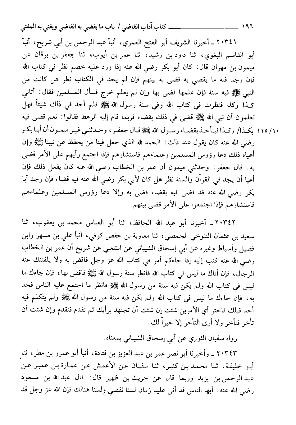 20342 - أَخْبَرَنَا أَبُو عَبْدِ اللهِ الْحَافِظُ , ثنا أَبُو الْعَبَّاسِ مُحَمَّدُ بْنُ يَعْقُوبَ، ثنا سَعِيدُ بْنُ عُثْمَانَ التَّنُوخِيُّ الْحِمْصِيُّ , ثنا مُعَاوِيَةُ بْنُ حَفْصٍ , كُوفِيٌّ ,، أنبأ عَلِيُّ بْنُ مُسْهِرٍ , وَابْنِ فُضَيْلٍ , وَأَسْبَاطٌ وَغَيْرُهُ , عَنْ أَبِي إِسْحَاقَ الشَّيْبَانِيِّ , عَنِ الشَّعْبِيِّ , عَنْ شُرَيْحٍ، أَنَّ عُمَرَ بْنَ الْخَطَّابِ رَضِيَ اللهُ عَنْهُ كَتَبَ إِلَيْهِ: §" إِذَا جَاءَكُمْ أَمْرٌ فِي كِتَابِ اللهِ عَزَّ وَجَلَّ فَاقْضِ بِهِ , وَلَا يَلْفِتَنَّكَ عَنْهُ الرِّجَالُ , فَإِنْ أَتَاكَ مَا لَيْسَ فِي كِتَابِ اللهِ، فَانْظُرْ سُنَّةَ رَسُولِ اللهِ صَلَّى اللهُ عَلَيْهِ وَسَلَّمَ , فَاقْضِ بِهَا، فَإِنْ جَاءَكَ مَا لَيْسَ فِي كِتَابِ اللهِ , وَلَمْ يَكُنْ فِيهِ سُنَّةٌ مِنْ رَسُولِ اللهِ صَلَّى اللهُ عَلَيْهِ وَسَلَّمَ , فَانْظُرْ مَا اجْتَمَعَ عَلَيْهِ النَّاسُ فَخُذْ بِهِ , فَإِنْ جَاءَكَ مَا لَيْسَ فِي كِتَابِ اللهِ , وَلَمْ يَكُنْ فِيهِ سُنَّةٌ مِنْ رَسُولِ اللهِ صَلَّى اللهُ عَلَيْهِ وَسَلَّمَ , وَلَمْ يَتَكَلَّمْ فِيهِ أَحَدٌ قَبْلَكَ , فَاخْتَرْ أِيَّ الْأَمْرَيْنِ شِئْتَ , إِنْ شِئْتَ أَنْ تَجْتَهِدَ بِرَأْيِكَ , ثُمَّ تُقَدِّمَ فَتُقَدِّمَ , وَإِنْ شِئْتَ أَنْ تُأَخِّرَ فَتُأَخِّرَ , وَلَا أَرَى التَّأَخُّرَ إِلَّا خَيْرًا لَكَ ". رَوَاهُ سُفْيَانُ الثَّوْرِيُّ عَنْ أَبِي إِسْحَاقَ الشَّيْبَانِيِّ بِمَعْنَاهُ