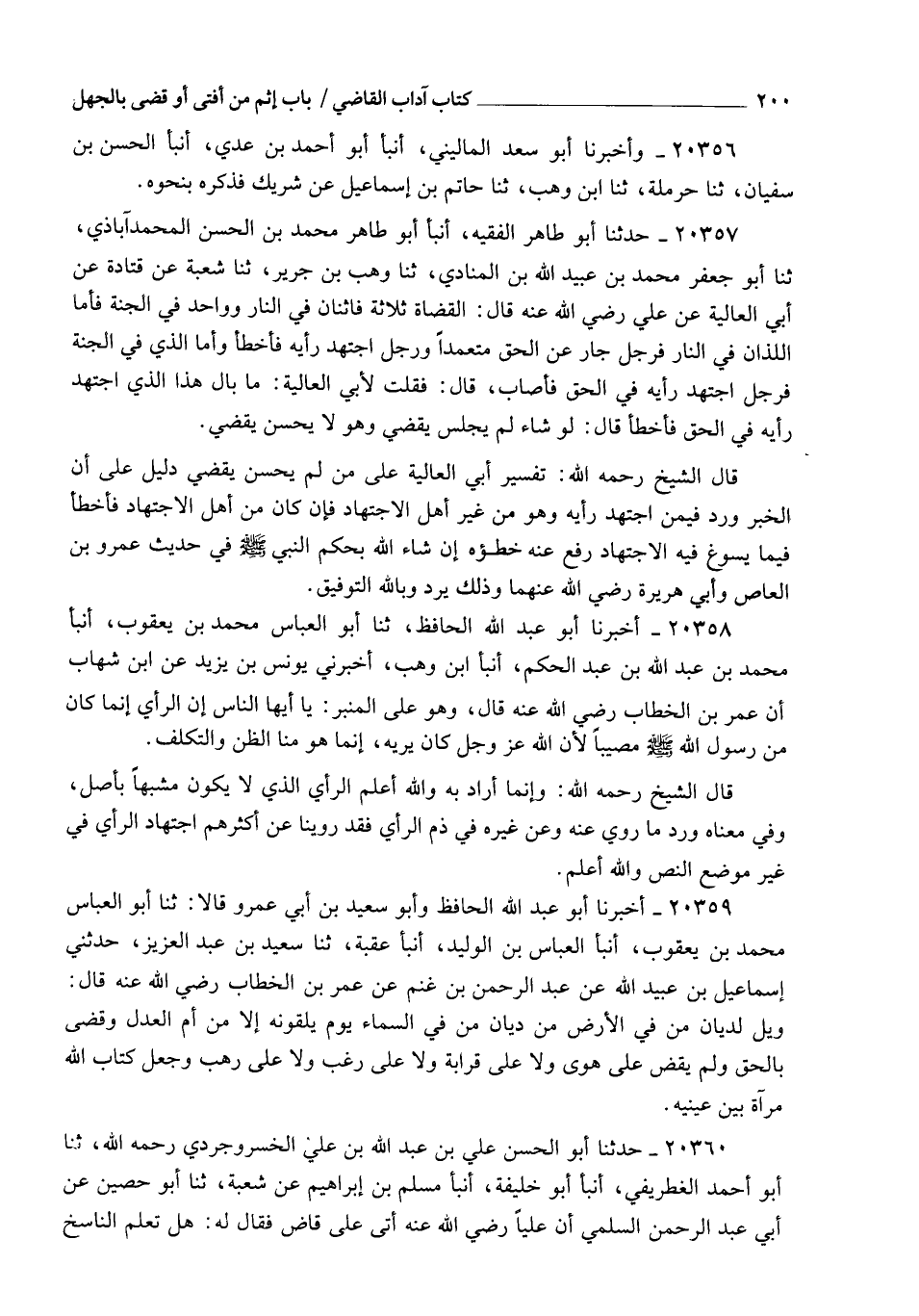 20357 - حَدَّثَنَا أَبُو طَاهِرٍ الْفَقِيهُ , أنبأ أَبُو طَاهِرٍ مُحَمَّدُ بْنُ الْحَسَنِ الْمُحَمَّدَآبَاذِيُّ، ثنا أَبُو جَعْفَرٍ مُحَمَّدُ بْنُ عُبَيْدِ اللهِ بْنِ الْمُنَادِي، ثنا وَهْبُ بْنُ جَرِيرٍ , ثنا شُعْبَةُ , عَنْ قَتَادَةَ , عَنْ أَبِي الْعَالِيَةِ , عَنْ عَلِيٍّ، رَضِيَ اللهُ عَنْهُ قَالَ: " §الْقُضَاةُ ثَلَاثَةٌ: فَاثْنَانِ فِي النَّارِ , وَوَاحِدٌ فِي الْجَنَّةِ، فَأَمَّا اللَّذَانِ فِي النَّارِ: فَرَجُلٌ جَارَ عَنِ الْحَقِّ مُتَعَمِّدًا , وَرَجُلٌ اجْتَهَدَ رَأْيَهُ فَأَخْطَأَ , وَأَمَّا الَّذِي فِي الْجَنَّةِ , فَرَجُلٌ اجْتَهَدَ رَأْيَهُ فِي الْحَقِّ فَأَصَابَ " , قَالَ: فَقُلْتُ لِأَبِي الْعَالِيَةِ: " مَا بَالُ هَذَا الَّذِي اجْتَهَدَ رَأْيَهُ فِي الْحَقِّ فَأَخْطَأَ؟ " قَالَ: " لَوْ شَاءَ لَمْ يَجْلِسْ يَقْضِي , وَهُوَ لَا يُحْسِنُ يَقْضِي ". قَالَ الشَّيْخُ رَحِمَهُ اللهُ: " تَفْسِيرُ أَبِي الْعَالِيَةِ عَلَى مَنْ لَمْ يُحْسِنْ يَقْضِي , دَلِيلٌ عَلَى أَنَّ الْخَبَرَ وَرَدَ فِيمَنِ اجْتَهَدَ رَأْيَهُ وَهُوَ مِنْ غَيْرِ أَهْلِ الِاجْتِهَادِ , فَإِنْ كَانَ مِنْ أَهْلِ الِاجْتِهَادِ فَأَخْطَأَ , فِيمَا يَسُوغُ فِيهِ الِاجْتِهَادُ , رُفِعَ عَنْهُ خَطَؤُهُ , إِنْ شَاءَ اللهُ , بِحُكْمِ النَّبِيِّ صَلَّى اللهُ عَلَيْهِ وَسَلَّمَ فِي حَدِيثِ عَمْرِو بْنِ الْعَاصِ وَأَبِي هُرَيْرَةَ رَضِيَ اللهُ عَنْهُمَا , وَذَلِكَ يَرِدُ وَبِاللهِ التَّوْفِيقُ