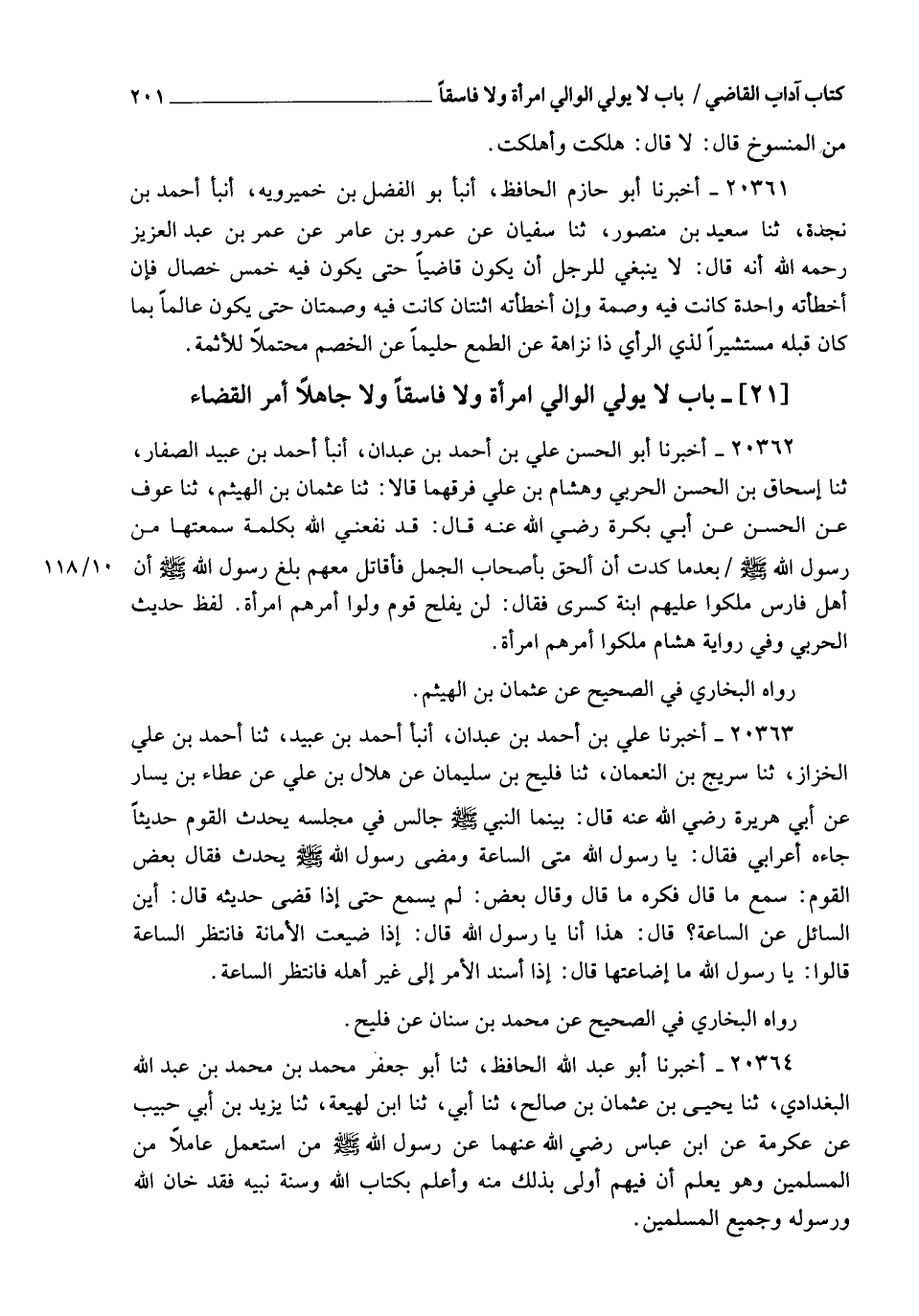 20362 - أَخْبَرَنَا أَبُو الْحَسَنِ عَلِيُّ بْنُ أَحْمَدَ بْنِ عَبْدَانَ، أنبأ أَحْمَدُ بْنُ عُبَيْدٍ الصَّفَّارُ , ثنا إِسْحَاقُ بْنُ الْحَسَنِ الْحَرْبِيُّ , وَهِشَامُ بْنُ عَلِيٍّ، فَرَّقَهُمَا قَالَا: ثنا عُثْمَانُ بْنُ الْهَيْثَمِ , ثنا عَوْفٌ , عَنِ الْحَسَنِ , عَنْ أَبِي بَكْرَةَ، رَضِيَ اللهُ عَنْهُ قَالَ: قَدْ نَفَعَنِي اللهُ بِكَلِمَةٍ سَمِعْتُهَا مِنْ رَسُولِ اللهِ صَلَّى اللهُ عَلَيْهِ وَسَلَّمَ بَعْدَمَا كِدْتُ أَنْ أَلْحَقَ بِأَصْحَابِ الْجَمَلِ فَأُقَاتِلَ مَعَهُمْ , بَلَغَ رَسُولَ اللهِ صَلَّى اللهُ عَلَيْهِ وَسَلَّمَ أَنَّ أَهْلَ فَارِسٍ مَلَّكُوا عَلَيْهِمُ ابْنَةَ كِسْرَى فَقَالَ: §" لَنْ يُفْلِحَ قَوْمٌ وَلَّوْا أَمْرَهُمُ امْرَأَةً ". لَفْظُ حَدِيثِ الْحَرْبِيِّ وَفِي رِوَايَةِ هِشَامٍ " مَلَّكُوا أَمْرَهُمُ امْرَأَةً " رَوَاهُ الْبُخَارِيُّ فِي الصَّحِيحِ , عَنْ عُثْمَانَ بْنِ الْهَيْثَمِ.