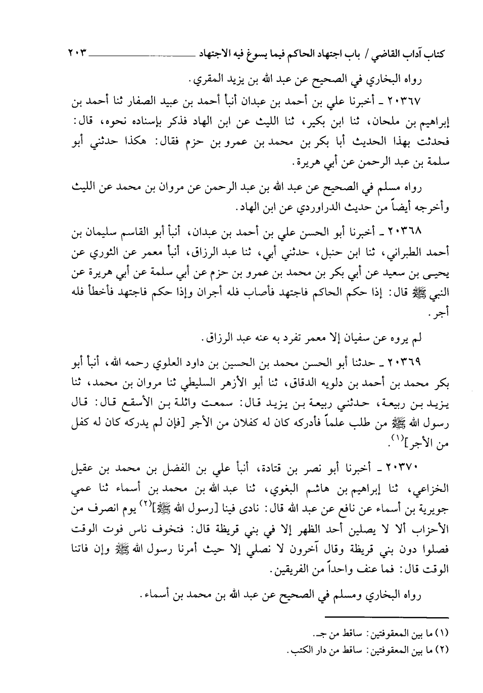 20368 - أَخْبَرَنَا أَبُو الْحَسَنِ عَلِيُّ بْنُ أَحْمَدَ بْنِ عَبْدَانَ، أنبأ أَبُو الْقَاسِمِ سُلَيْمَانُ بْنُ أَحْمَدَ الطَّبَرَانِيُّ، ثنا ابْنُ حَنْبَلٍ , حَدَّثَنِي أَبِي , ثنا عَبْدُ الرَّزَّاقِ , أنبأ مَعْمَرٌ , عَنِ الثَّوْرِيِّ , عَنْ يَحْيَى بْنِ سَعِيدٍ , عَنْ أَبِي بَكْرِ بْنِ مُحَمَّدِ بْنِ عَمْرِو بْنِ حَزْمٍ , عَنْ أَبِي سَلَمَةَ , عَنْ أَبِي هُرَيْرَةَ , عَنِ النَّبِيِّ صَلَّى اللهُ عَلَيْهِ وَسَلَّمَ قَالَ: §" إِذَا حَكَمَ الْحَاكِمُ , فَاجْتَهَدَ فَأَصَابَ فَلَهُ أَجْرَانِ , وَإِذَا حَكَمَ فَاجْتَهَدَ فَأَخْطَأَ فَلَهُ أَجْرٌ ". لَمْ يَرْوِهِ عَنْ سُفْيَانَ إِلَّا مَعْمَرٌ تَفَرَّدَ بِهِ عَنْهُ عَبْدُ الرَّزَّاقِ