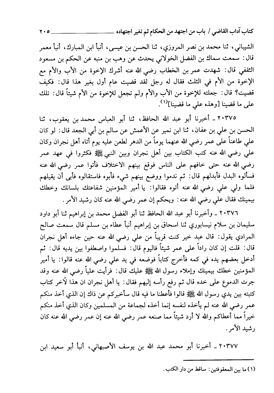 20375 - أَخْبَرَنَا أَبُو عَبْدِ اللهِ الْحَافِظُ , ثنا أَبُو الْعَبَّاسِ مُحَمَّدُ بْنُ يَعْقُوبَ، ثنا الْحَسَنُ بْنُ عَلِيِّ بْنِ عَفَّانَ , ثنا ابْنُ نُمَيْرٍ , عَنِ الْأَعْمَشِ , عَنْ سَالِمِ بْنِ أَبِي الْجَعْدِ، قَالَ: " لَوْ كَانَ عَلِيٌّ طَاعِنًا عَلَى عُمَرَ رَضِيَ اللهُ عَنْهُمَا يَوْمًا مِنَ الدَّهْرِ لطَعَنَ عَلَيْهِ يَوْمَ أَتَاهُ أَهْلُ نَجْرَانَ وَكَانَ عَلِيٌّ رَضِيَ اللهُ عَنْهُ كَتَبَ الْكِتَابَ بَيْنَ أَهْلِ نَجْرَانَ وَبَيْنِ النَّبِيِّ صَلَّى اللهُ عَلَيْهِ وَسَلَّمَ , فَكَثُرُوا فِي عَهْدِ عُمَرَ رَضِيَ اللهُ عَنْهُ حَتَّى خَافَهُمْ عَلَى النَّاسِ , فَوَقَعَ بَيْنَهَمُ الِاخْتِلَافُ , فَأَتَوْا عُمَرَ رَضِيَ اللهُ عَنْهُ , فَسَأَلُوهُ الْبَدَلَ فَأَبْدَلَهُمْ , قَالَ: ثُمَّ نَدِمُوا , وَوَضَعَ بَيْنَهُمْ شَيئًا فَأَبَوْهُ فَاسْتَقَالُوهُ فَأَبَى أَنْ يُقِيلَهُمْ فَلَمَّا وَلِيَ عَلِيٌّ رَضِيَ اللهُ عَنْهُ أَتَوْهُ فَقَالُوا: يَا أَمِيرَ الْمُؤْمِنِينَ شَفَاعَتُكَ بِلِسَانِكَ وَخَطُّكَ بِيَمِينِكَ , فَقَالَ عَلِيٌّ رَضِيَ اللهُ عَنْهُ: §" وَيْحَكُمْ إِنَّ عُمَرَ رَضِيَ اللهُ عَنْهُ كَانَ رَشِيدَ الْأَمْرِ "