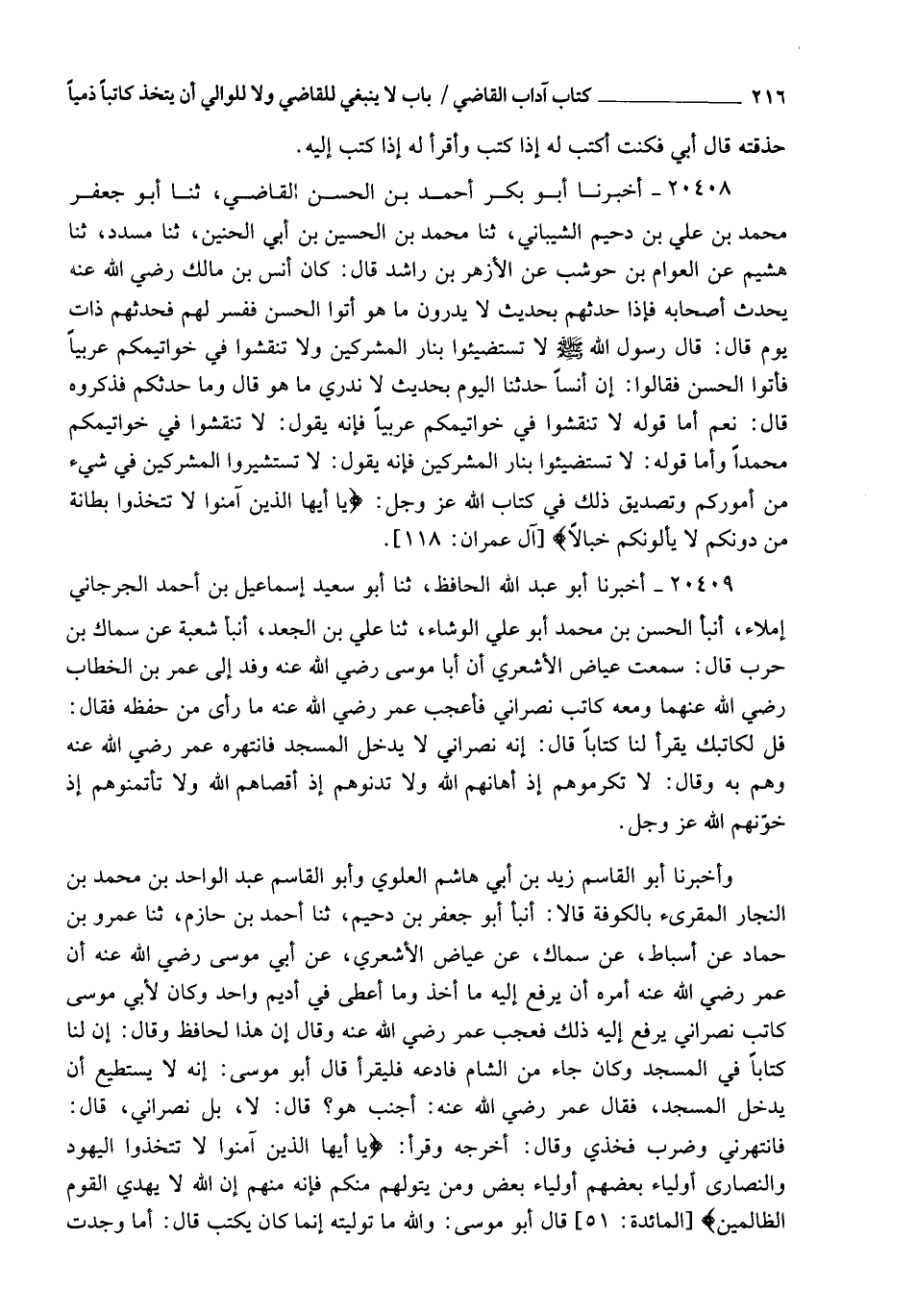 20409 - أَخْبَرَنَا أَبُو عَبْدِ اللهِ الْحَافِظُ , ثنا أَبُو سَعِيدٍ إِسْمَاعِيلُ بْنُ أَحْمَدَ الْجُرْجَانِيُّ إِمْلَاءً، أنبأ الْحَسَنُ بْنُ مُحَمَّدٍ أَبُوعَلِيٍّ الْوَشَّاءُ، ثنا عَلِيُّ بْنُ الْجَعْدِ , أنبأ شُعْبَةُ , عَنْ سِمَاكِ بْنِ حَرْبٍ، قَالَ: سَمِعْتُ عِيَاضًا الْأَشْعَرِيَّ، أَنَّ أَبَا مُوسَى، رَضِيَ اللهُ عَنْهُ وَفَدَ إِلَى عُمَرَ بْنِ الْخَطَّابِ رَضِيَ اللهُ عَنْهُمَا , وَمَعَهُ كَاتَبٌ نَصْرَانِيُّ , فَأَعْجَبَ عُمَرَ رَضِيَ اللهُ عَنْهُ مَا رَأَى مِنْ حِفْظِهِ , فَقَالَ: " قُلْ لِكَاتِبِكَ يَقْرَأْ لَنَا كِتَابًا " , قَالَ: إِنَّهُ نَصْرَانِيٌّ , لَا يَدْخُلُ الْمَسْجِدَ , فَانْتَهَرَهُ عُمَرُ رَضِيَ اللهُ عَنْهُ , وَهَمَّ بِهِ , وَقَالَ: §" لَا تُكْرِمُوهُمْ إِذْ أَهَانَهُمُ اللهُ , وَلَا تُدْنُوهُمْ إِذْ أَقْصَاهُمُ اللهُ , وَلَا تَأْتَمِنُوهُمْ إِذْ خَوَّنَهُمُ اللهُ عَزَّ وَجَلَّ "