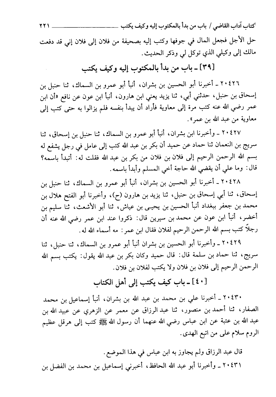 20427 - وَأَخْبَرَنَا ابْنُ بِشْرَانَ , أنبأ أَبُو عَمْرِو بْنُ السَّمَّاكِ , ثنا حَنْبَلُ بْنُ إِسْحَاقَ , ثنا سُرَيْجُ بْنُ النُّعْمَانِ , ثنا حَمَّادٌ , عَنْ حُمَيْدٍ، أَنَّ بَكْرَ بْنَ عَبْدِ اللهِ كَتَبَ إِلَى عَامَلٍ فِي رَجُلٍ يَشْفَعُ لَهُ: " {§بِسْمِ اللهِ الرَّحْمَنِ الرَّحِيمِ} [الفاتحة: 1] إِلَى فُلَانِ ابْنِ فُلَانٍ مِنْ بَكْرِ بْنِ عَبْدِ اللهِ فَقُلْتُ لَهُ: أَتَبْدَأُ بِاسْمِهِ؟ قَالَ: " وَمَا عَلَيَّ أَنْ يَقْضِيَ اللهُ حَاجَةَ أَخِي الْمُسْلِمِ , وَأَبْدَأَ بِاسْمِهِ "