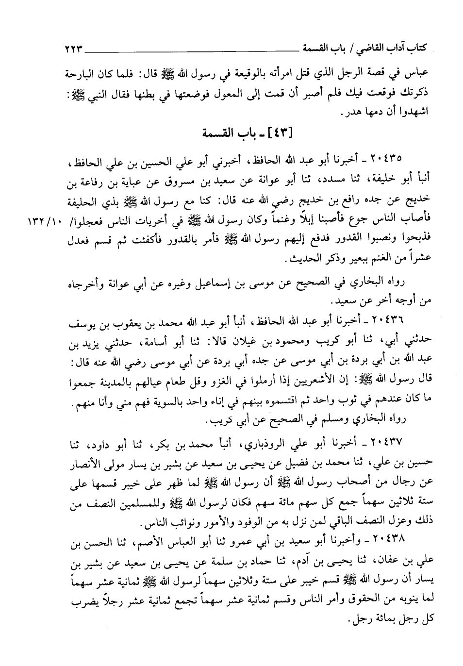 20435 - أَخْبَرَنَا أَبُو عَبْدِ اللهِ الْحَافِظُ , أَخْبَرَنِي أَبُو عَلِيٍّ الْحُسَيْنُ بْنُ عَلِيٍّ الْحَافِظُ , أنبأ أَبُو خَلِيفَةَ , ثنا مُسَدَّدٌ , ثنا أَبُو عَوَانَةَ , عَنْ سَعِيدِ بْنِ مَسْرُوقٍ , عَنْ عَبَايَةَ بْنِ رِفَاعَةَ بْنِ رَافِعِ بْنِ خَدِيجٍ , عَنْ جَدِّهِ رَافِعِ بْنِ خَدِيجٍ رَضِيَ اللهُ عَنْهُ , قَالَ: كُنَّا مَعَ رَسُولِ اللهِ صَلَّى اللهُ عَلَيْهِ وَسَلَّمَ بِذِي الْحُلَيْفَةِ , فَأَصَابَ النَّاسَ جُوعٌ , فَأَصَبْنَا إِبِلًا وَغَنَمًا , وَكَانَ رَسُولُ اللهِ صَلَّى اللهُ عَلَيْهِ وَسَلَّمَ فِي أُخْرَيَاتِ النَّاسِ , فَعَجِلُوا فَذَبَحُوا وَنَصَبُوا الْقُدُورَ , فَدَفَعَ إِلَيْهِمْ رَسُولُ اللهِ صَلَّى اللهُ عَلَيْهِ وَسَلَّمَ §فَأَمَرَ بِالْقُدُورِ فَأُكْفِئَتْ , ثُمَّ قَسَمَ فَعَدَلَ عَشْرًا مِنَ الْغَنَمِ بِبَعِيرٍ "، وَذَكَرَ الْحَدِيثَ. رَوَاهُ الْبُخَارِيُّ فِي الصَّحِيحِ عَنْ مُوسَى بْنِ إِسْمَاعِيلَ وَغَيْرِهِ , عَنْ أَبِي عَوَانَةَ , وَأَخْرَجَاهُ مِنْ أَوْجُهٍ أُخَرَ عَنْ سَعِيدٍ