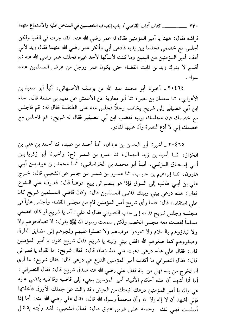 20465 - أَخْبَرَنَا أَبُو الْحَسَنِ بْنُ عَبْدَانَ , أنبأ أَحْمَدُ بْنُ عُبَيْدٍ , ثنا أَحْمَدُ بْنُ عَلِيٍّ الْخَزَّازُ، ثنا أُسَيْدُ بْنُ زَيْدٍ الْجَمَّالُ , ثنا عَمْرُو بْنُ شِمْرٍ ح وَأَخْبَرَنَا أَبُو زَكَرِيَّا بْنُ أَبِي إِسْحَاقَ الْمُزَكِّي , أنبأ أَبُو مُحَمَّدِ بْنُ الْخُرَاسَانِيِّ , ثنا مُحَمَّدُ بْنُ عُبَيْدِ بْنِ أَبِي هَارُونَ , ثنا إِبْرَاهِيمُ بْنُ حَبِيبٍ , ثنا عَمْرُو بْنُ شِمْرٍ , عَنْ جَابِرٍ، عَنِ الشَّعْبِيِّ، قَالَ: خَرَجَ عَلِيُّ بْنُ أَبِي طَالِبٍ رَضِيَ اللهُ عَنْهُ إِلَى السُّوقِ , فَإِذَا هُوَ بِنَصْرَانِيٍّ يَبِيعُ دِرْعًا، قَالَ: فَعَرَفَ عَلِيٌّ رَضِيَ اللهُ عَنْهُ الدِّرْعَ فَقَالَ: هَذِهِ دِرْعِي، بَيْنِي وَبَيْنَكَ قَاضِي الْمُسْلِمِينَ، قَالَ: وَكَانَ قَاضِيَ الْمُسْلِمِينَ شُرَيْحٌ، كَانَ عَلِيٌّ رَضِيَ اللهُ عَنْهُ اسْتَقْضَاهُ، قَالَ: فَلَمَّا رَأَى شُرَيْحٌ أَمِيرَ الْمُؤْمِنِينَ قَامَ مِنْ مَجْلِسِ الْقَضَاءِ، وَأَجْلَسَ عَلِيًّا رَضِيَ اللهُ عَنْهُ فِي مَجْلِسِهِ , وَجَلَسَ شُرَيْحٌ قُدَّامَهُ إِلَى جَنْبِ النَّصْرَانِيِّ، فَقَالَ لَهُ عَلِيٌّ رَضِيَ اللهُ عَنْهُ: أَمَا يَا شُرَيْحُ لَوْ كَانَ خَصْمِي مُسْلِمًا لَقَعَدْتُ مَعَهُ مَجْلِسَ الْخَصْمِ، وَلَكِنِّي سَمِعْتُ رَسُولَ اللهِ صَلَّى اللهُ عَلَيْهِ وَسَلَّمَ يَقُولُ: " §لَا تُصَافِحُوهُمْ، وَلَا تَبْدَؤُوهُمْ بِالسَّلَامِ، وَلَا تَعُودُوا مَرْضَاهُمْ , وَلَا تُصَلُّوا عَلَيْهِمْ، وَأَلْجِئُوهُمْ إِلَى مَضَايِقِ الطُّرُقِ، وَصَغِّرُوهُمْ كَمَا صَغَّرَهُمُ اللهُ " , اقْضِ بَيْنِي وَبَيْنَهُ يَا شُرَيْحُ، فَقَالَ شُرَيْحٌ: تَقُولُ يَا أَمِيرَ الْمُؤْمِنِينَ، قَالَ: فَقَالَ عَلِيٌّ رَضِيَ اللهُ عَنْهُ: هَذِهِ دِرْعِي ذَهَبَتْ مِنِّي مُنْذُ زَمَانٍ، قَالَ: فَقَالَ شُرَيْحٌ: مَا تَقُولُ يَا نَصْرَانِيُّ؟ قَالَ: فَقَالَ النَّصْرَانِيُّ: مَا أُكُذِّبُ أَمِيرَ الْمُؤْمِنِينَ، الدِّرْعُ هِيَ دِرْعِي قَالَ: فَقَالَ شُرَيْحٌ: مَا أَرَى أَنْ تُخْرَجَ مِنْ يَدِهِ، فَهَلْ مِنْ بَيِّنَةٍ؟ فَقَالَ عَلِيٌّ رَضِيَ اللهُ عَنْهُ: صَدَقَ شُرَيْحٌ، قَالَ: فَقَالَ النَّصْرَانِيُّ: أَمَّا أَنَا، أَشْهَدُ أَنَّ هَذِهِ أَحْكَامُ الْأَنْبِيَاءِ، أَمِيرُ الْمُؤْمِنِينَ يَجِيءُ إِلَى قَاضِيهِ، وَقَاضِيهِ يَقْضِي عَلَيْهِ هِيَ وَاللهِ يَا أَمِيرَ الْمُؤْمِنِينَ دِرْعُكَ، اتَّبَعْتُكَ مِنَ الْجَيْشِ وَقَدْ زَالَتْ عَنْ جَمَلِكَ الْأَوْرَقِ، فَأَخَذْتُهَا، فَإِنِّي أَشْهَدُ أَنْ لَا إِلَهَ إِلَّا اللهُ، وَأَنَّ مُحَمَّدًا رَسُولُ اللهِ، قَالَ: فَقَالَ عَلِيٌّ رَضِيَ اللهُ عَنْهُ: أَمَّا إِذَا أَسْلَمْتَ فَهِيَ لَكَ، وَحَمَلَهُ عَلَى فَرَسٍ عَتِيقٍ " قَالَ: فَقَالَ الشَّعْبِيُّ: لَقَدْ رَأَيْتُهُ يُقَاتِلُ -[231]- الْمُشْرِكِينَ هَذَا لَفْظُ حَدِيثِ أَبِي زَكَرِيَّا، وَفِي رِوَايَةِ ابْنِ عَبْدَانَ قَالَ: يَا شُرَيْحُ، لَوْلَا أَنَّ خَصْمِيَ نَصْرَانِيٌّ لَجَثَيْتُ بَيْنَ يَدَيْكَ، وَقَالَ فِي آخِرِهِ: قَالَ: فَوَهَبَهَا عَلِيٌّ رَضِيَ اللهُ عَنْهُ لَهُ، وَفَرَضَ لَهُ أَلْفَيْنِ، وَأُصِيبَ مَعَهُ يَوْمَ صِفِّينَ، وَالْبَاقِي بِمَعْنَاهُ، وَرُوِيَ مِنْ وَجْهٍ آخَرَ أَيْضًا ضَعِيفٍ عَنِ الْأَعْمَشِ، عَنْ إِبْرَاهِيمَ التَّيْمِيِّ