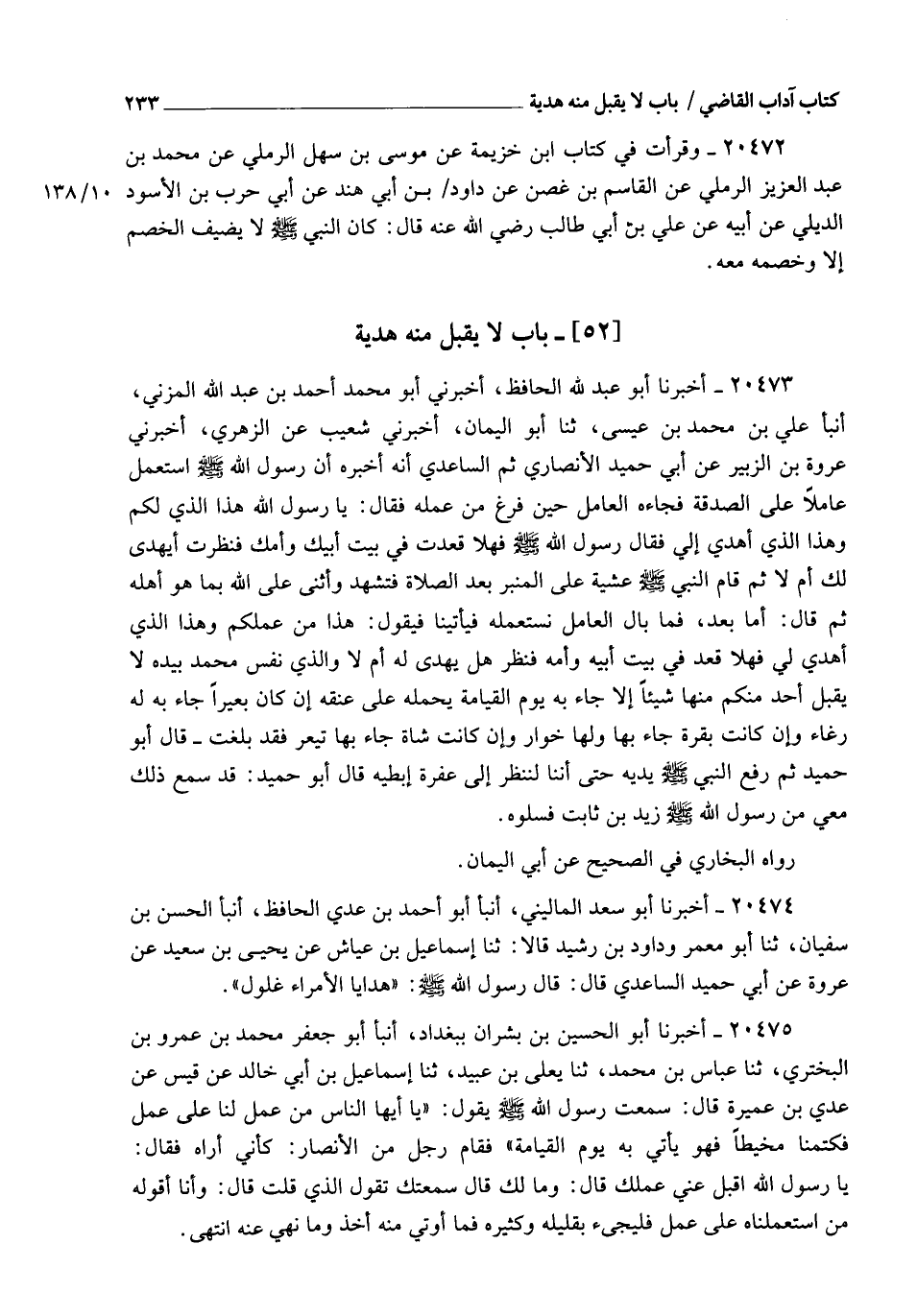 20473 - أَخْبَرَنَا أَبُو عَبْدِ اللهِ الْحَافِظُ , أَخْبَرَنِي أَبُو مُحَمَّدٍ أَحْمَدُ بْنُ عَبْدِ اللهِ الْمُزَنِيُّ , أنبأ عَلِيُّ بْنُ مُحَمَّدِ بْنِ عِيسَى , ثنا أَبُو الْيَمَانِ , أَخْبَرَنِي شُعَيْبٌ , عَنِ الزُّهْرِيِّ , أَخْبَرَنِي عُرْوَةُ بْنُ الزُّبَيْرِ , عَنْ أَبِي حُمَيْدٍ الْأَنْصَارِيِّ , ثُمَّ السَّاعِدِيِّ أَنَّهُ أَخْبَرَهُ أَنَّ رَسُولَ اللهِ صَلَّى اللهُ عَلَيْهِ وَسَلَّمَ اسْتَعْمَلَ عَامِلًا عَلَى الصَّدَقَةِ , فَجَاءَهُ الْعَامِلُ حِينَ فَرَغَ مِنْ عَمَلِهِ , فَقَالَ: يَا رَسُولَ اللهِ , هَذَا الَّذِي لَكُمْ , وَهَذَا الَّذِي أُهْدِيَ إِلِيَّ , فَقَالَ رَسُولُ اللهِ صَلَّى اللهُ عَلَيْهِ وَسَلَّمَ: " §فَهَلَّا قَعَدْتَ فِي بَيْتِ أَبِيكَ وَأُمِّكَ فَنَظَرْتَ: أَيُهْدَى لَكَ أَمْ لَا "؟ ثُمَّ قَامَ النَّبِيُّ صَلَّى اللهُ عَلَيْهِ وَسَلَّمَ عَشِيَّةً عَلَى الْمِنْبَرِ بَعْدَ الصَّلَاةِ , فَتَشَهَّدَ وَأَثْنَى عَلَى اللهِ بِمَا هُوَ أَهْلُهُ ثُمَّ قَالَ: " أَمَّا بَعْدُ , فَمَا بَالُ الْعَامِلِ نَسْتَعْمِلُهُ فَيَأْتِيَنَا , فَيَقُولَ: هَذَا مِنْ عَمَلِكُمْ , وَهَذَا الَّذِي أُهْدِيَ لِي , فَهَلَّا قَعَدَ فِي بَيْتِ أَبِيهِ وَأُمِّهِ فَنَظَرَ: هَلْ يُهْدَى لَهُ أَمْ لَا؟ وَالَّذِي نَفْسُ مُحَمَّدٍ بِيَدِهِ لَا يَقْبَلُ أَحَدٌ مِنْكُمْ مِنْهَا شَيْئًا إِلَّا جَاءَ بِهِ يَوْمَ الْقِيَامَةِ يَحْمِلُهُ عَلَى عُنُقِهِ , إِنْ كَانَ بَعِيرًا جَاءَ بِهِ لَهُ رُغَاءٌ , وَإِنْ كَانَتْ بَقَرَةً جَاءَ بِهَا وَلَهَا خُوَارٌ , وَإِنْ كَانَتْ شَاةً جَاءَ بِهَا تَيْعَرُ , فَقَدْ بَلَّغْتُ " , قَالَ أَبُو حُمَيْدٍ: ثُمَّ رَفَعَ النَّبِيُّ صَلَّى اللهُ عَلَيْهِ وَسَلَّمَ يَدَيْهِ حَتَّى إِنَّنَا لَنَنْظُرُ إِلَى عُفْرَةِ إِبْطَيْهِ. قَالَ أَبُو حُمَيْدٍ: قَدْ سَمِعَ ذَلِكَ مَعِي مِنْ رَسُولِ اللهِ صَلَّى اللهُ عَلَيْهِ وَسَلَّمَ زَيْدُ بْنُ ثَابِتٍ فَسَلُوهُ. رَوَاهُ الْبُخَارِيُّ فِي الصَّحِيحِ عَنْ أَبِي الْيَمَانِ