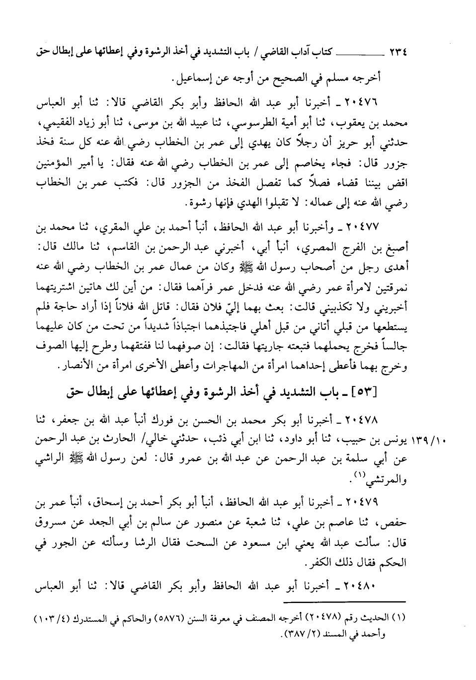 20476 - أَخْبَرَنَا أَبُو عَبْدِ اللهِ الْحَافِظُ , وَأَبُو بَكْرٍ الْقَاضِي قَالَا: ثنا أَبُو الْعَبَّاسِ مُحَمَّدُ بْنُ يَعْقُوبَ , ثنا أَبُو أُمَيَّةَ الطَّرَسُوسِيُّ , ثنا عُبَيْدُ اللهِ بْنُ مُوسَى , ثنا أَبُو زِيَادٍ الْفُقَيْمِيُّ , حَدَّثَنِي أَبُو حَرِيزٍ، أَنَّ رَجُلًا كَانَ يُهْدِي إِلَى عُمَرَ بْنِ الْخَطَّابِ رَضِيَ اللهُ عَنْهُ كُلَّ سَنَةٍ فَخِذَ جَزُورٍ , قَالَ: فَجَاءَ يُخَاصِمُ إِلَى عُمَرَ بْنِ الْخَطَّابِ رَضِيَ اللهُ عَنْهُ , فَقَالَ: يَا أَمِيرَ الْمُؤْمِنِينَ , اقْضِ بَيْنَنَا قَضَاءً فَصْلًا كَمَا تَفْصِلُ الْفَخِذَ مِنَ الْجَزُورِ , قَالَ: فَكَتَبَ عُمَرُ بْنُ الْخَطَّابِ رَضِيَ اللهُ عَنْهُ إِلَى عُمَّالِهِ: §" لَا تَقْبَلُوا الْهَدْيَ , فَإِنَّهَا رِشْوَةٌ "