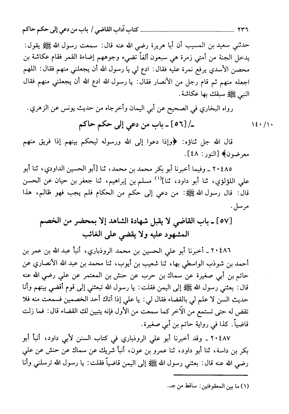 20485 - وَفِيمَا أَخْبَرَنَا أَبُو بَكْرٍ مُحَمَّدُ بْنُ مُحَمَّدٍ , ثنا أَبُو الْحُسَيْنِ الدَّاوُدِيُّ , ثنا أَبُو عَلِيٍّ اللُّؤْلُؤِيُّ , ثنا أَبُو دَاوُدَ , ثنا مُسْلِمُ بْنُ إِبْرَاهِيمَ , ثنا جَعْفَرُ بْنُ حَيَّانَ , عَنِ الْحَسَنِ، قَالَ: قَالَ رَسُولُ اللهِ صَلَّى اللهُ عَلَيْهِ وَسَلَّمَ: §" مَنْ دُعِيَ إِلَى حَكَمٍ مِنَ الْحُكَّامِ فَلَمْ يُجِبْ فَهُوَ ظَالِمٌ " هَذَا مُرْسَلٌ