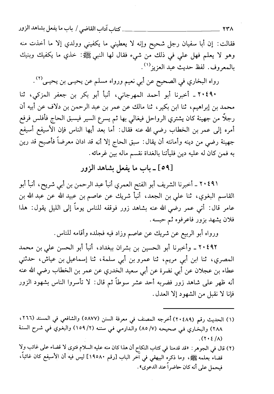 20491 - أَخْبَرَنَا الشَّرِيفُ أَبُو الْفَتْحِ الْعُمَرِيُّ , أنبأ عَبْدُ الرَّحْمَنِ بْنُ أَبِي شُرَيْحٍ , أنبأ أَبُو الْقَاسِمِ الْبَغَوِيُّ , ثنا عَلِيُّ بْنُ الْجَعْدِ , أنبأ شَرِيكٌ , عَنْ عَاصِمِ بْنِ عُبَيْدِ اللهِ , عَنْ عَبْدِ اللهِ بْنِ عَامِرٍ، قَالَ: أُتِيَ عُمَرُ رَضِيَ اللهُ عَنْهُ بِشَاهِدِ زُورٍ , فَوَقَفَهُ لِلنَّاسِ يَوْمًا إِلَى اللَّيْلِ يَقُولُ: " §هَذَا فُلَانٌ , يَشْهَدُ بِزُورٍ فَاعْرِفُوهُ " , ثُمَّ حَبَسَهُ. وَرَوَاهُ أَبُو الرَّبِيعِ , عَنْ شَرِيكٍ , عَنْ عَاصِمٍ وَزَادَ فِيهِ: " فَجَلَدَهُ وَأَقَامَهُ لِلنَّاسِ "