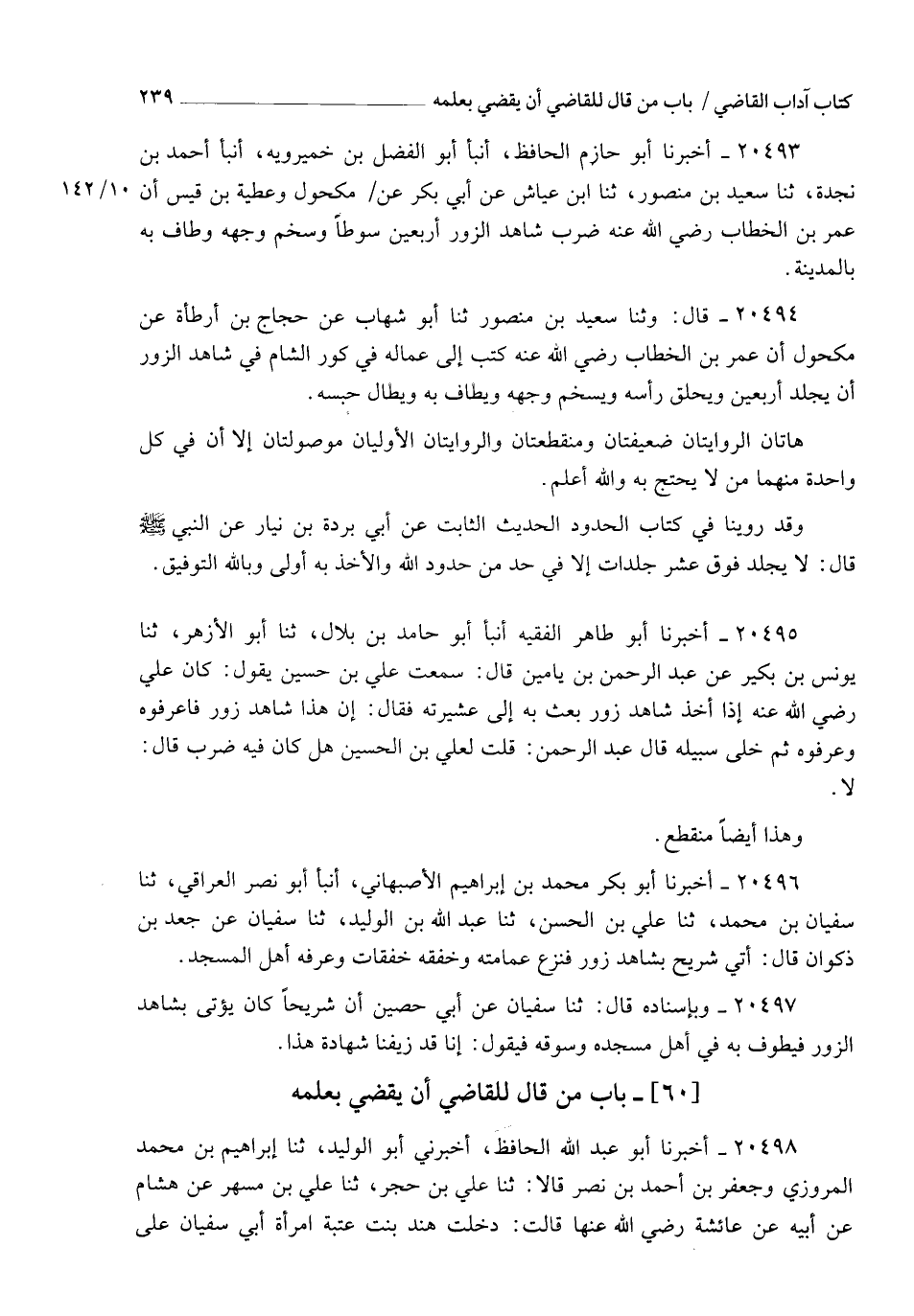 20494 - قَالَ: وَثَنَا سَعِيدُ بْنُ مَنْصُورٍ , ثنا أَبُو شِهَابٍ , عَنْ حَجَّاجِ بْنِ أَرْطَاةَ , عَنْ مَكْحُولٍ , أَنَّ عُمَرَ بْنَ الْخَطَّابِ رَضِيَ اللهُ عَنْهُ §كَتَبَ إِلَى عُمَّالِهِ فِي كُورِ الشَّامِ فِي شَاهِدِ الزُّورِ: " أَنْ يُجْلَدَ أَرْبَعِينَ , وَيُحْلَقَ رَأْسُهُ , وَيُسْخَمَ وَجْهُهُ , وَيُطَافَ بِهِ , وَيُطَالَ حَبْسُهُ ". هَاتَانِ الرِّوَايَتَانِ ضَعِيفَتَانِ وَمُنْقَطِعَتَانِ , وَالرِّوَايَتَانِ الْأُولَيَانِ مَوْصُولَتَانِ , إِلَّا أَنَّ فِي كُلِّ وَاحِدَةٍ مِنْهُمَا مَنْ لَا يُحْتَجُّ بِهِ , وَاللهُ أَعْلَمُ , وَقَدْ رَوَيْنَا فِي كِتَابِ الْحُدُودِ الْحَدِيثَ الثَّابِتَ عَنْ أَبِي بُرْدَةَ بْنِ نِيَارٍ عَنِ النَّبِيِّ صَلَّى اللهُ عَلَيْهِ وَسَلَّمَ , قَالَ: " لَا يُجْلَدْ فَوْقَ عَشْرِ جَلَدَاتٍ إِلَّا فِي حَدٍّ مِنْ حُدُودِ اللهِ ". وَالْأَخْذُ بِهِ أَوْلَى , وَبِاللهِ التَّوْفِيقُ