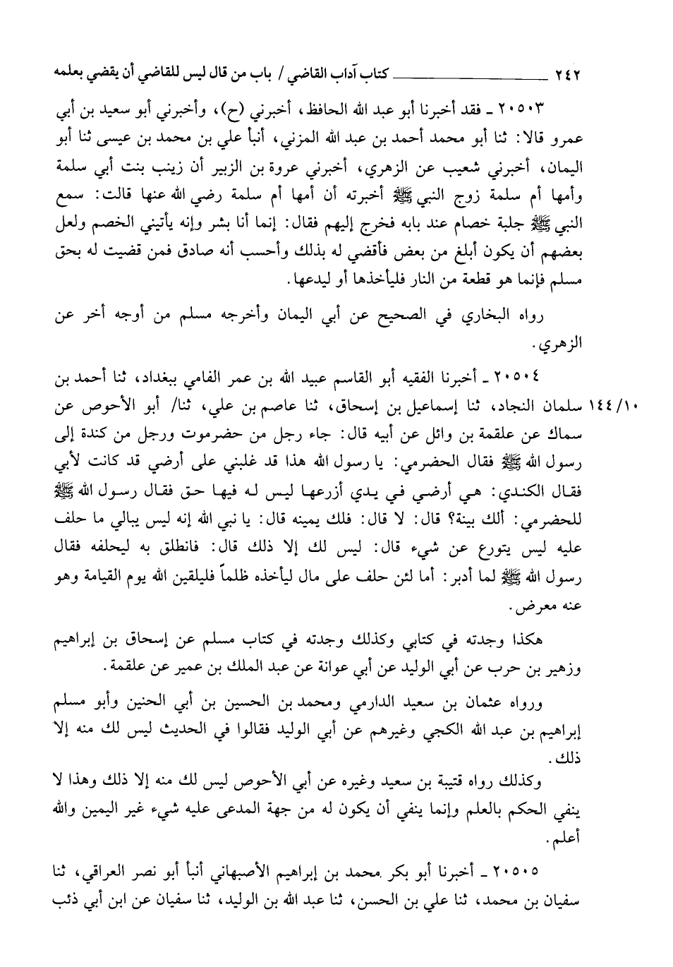 20503 - فَقَدْ أَخْبَرَنَا أَبُو عَبْدِ اللهِ الْحَافِظُ , أَخْبَرَنِي، ح، وَأَخْبَرَنِي أَبُو سَعِيدِ بْنُ أَبِي عَمْرٍو، قَالَا: ثنا أَبُو مُحَمَّدٍ أَحْمَدُ بْنُ عَبْدِ اللهِ الْمُزَنِيُّ , أنبأ عَلِيُّ بْنُ مُحَمَّدِ بْنِ عِيسَى , ثنا أَبُو الْيَمَانِ , أَخْبَرَنِي شُعَيْبٌ , عَنِ الزُّهْرِيِّ , أَخْبَرَنِي عُرْوَةُ بْنُ الزُّبَيْرِ , أَنَّ زَيْنَبَ بِنْتَ أَبِي سَلَمَةَ , وَأُمَّهَا أُمَّ سَلَمَةَ، زَوْجَ النَّبِيِّ صَلَّى اللهُ عَلَيْهِ وَسَلَّمَ , أَخْبَرَتْهُ أَنَّ أُمَّهَا أُمَّ سَلَمَةَ رَضِيَ اللهُ عَنْهَا قَالَتْ: سَمِعَ النَّبِيُّ صَلَّى اللهُ عَلَيْهِ وَسَلَّمَ جَلَبَةَ خِصَامٍ عِنْدَ بَابِهِ , فَخَرَجَ إِلَيْهِمْ فَقَالَ: §" إِنَّمَا أَنَا بَشَرٌ , وَإِنَّهُ يَأْتِينِي الْخَصْمُ , وَلَعَلَّ بَعْضَهُمْ أَنْ يَكُونَ أَبْلَغَ مِنْ بَعْضٍ , فَأَقْضِيَ لَهُ بِذَلِكَ , وَأَحْسِبَ أَنَّهُ صَادِقٌ , فَمَنْ قَضَيْتُ لَهُ بِحَقِّ مُسْلِمٍ فَإِنَّمَا هُوَ قِطْعَةٌ مِنَ النَّارِ , فَلْيَأْخُذْهَا أَوْ لِيَدَعْهَا ". رَوَاهُ الْبُخَارِيُّ فِي الصَّحِيحِ عَنْ أَبِي الْيَمَانِ , وَأَخْرَجَهُ مُسْلِمٌ مِنْ أَوْجُهٍ أُخَرَ عَنِ الزُّهْرِيِّ
