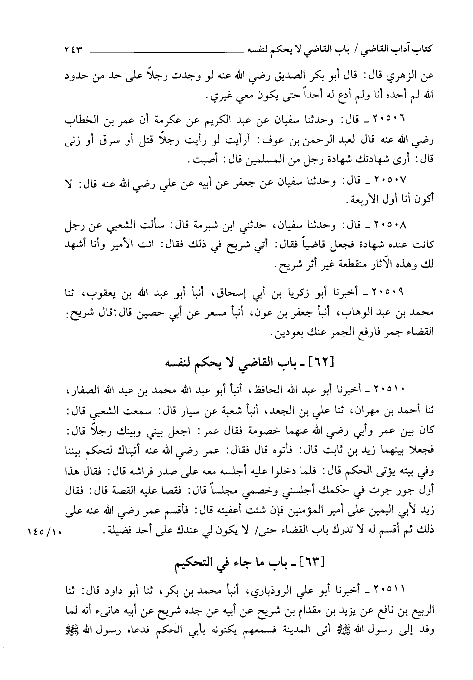 20510 - أَخْبَرَنَا أَبُو عَبْدِ اللهِ الْحَافِظُ , أنبأ أَبُو عَبْدِ اللهِ مُحَمَّدُ بْنُ عَبْدِ اللهِ الصَّفَّارُ , ثنا أَحْمَدُ بْنُ مِهْرَانَ , ثنا عَلِيُّ بْنُ الْجَعْدِ , أنبأ شُعْبَةُ , عَنْ سَيَّارٍ، قَالَ: سَمِعْتُ الشَّعْبِيَّ، قَالَ: §كَانَ بَيْنَ عُمَرَ وَأُبَيٍّ رَضِيَ اللهُ عَنْهُمَا خُصُومَةٌ , فَقَالَ عُمَرُ: " اجْعَلْ بَيْنِي وَبَيْنَكَ رَجُلًا " , قَالَ: فَجَعَلَا بَيْنَهُمَا زَيْدَ بْنَ ثَابِتٍ , قَالَ: فَأَتَوْهُ , قَالَ: فَقَالَ عُمَرُ رَضِيَ اللهُ عَنْهُ: " أَتَيْنَاكَ لِتَحْكُمَ بَيْنَنَا , وَفِي بَيْتِهِ يُؤْتَى الْحَكَمُ " , قَالَ: فَلَمَّا دَخَلُوا عَلَيْهِ أَجْلَسَهُ مَعَهُ عَلَى صَدْرِ فِرَاشِهِ , قَالَ: فَقَالَ: هَذَا أَوَّلُ جَوْرٍ جُرْتَ فِي حُكْمِكَ , أَجْلِسْنِي وَخَصْمِي مَجْلِسًا " , قَالَ: فَقَصَّا عَلَيْهِ الْقِصَّةَ , قَالَ: فَقَالَ زَيْدٌ لِأُبَيٍّ: الْيَمِينُ عَلَى أَمِيرِ الْمُؤْمِنِينَ , فَإِنْ شِئْتَ أَعْفَيْتَهُ , قَالَ: فَأَقْسَمَ عُمَرُ رَضِيَ اللهُ عَنْهُ عَلَى ذَلِكَ , ثُمَّ أَقْسَمَ لَهُ: " لَا تُدْرِكْ بَابَ الْقَضَاءِ حَتَّى لَا يَكُونَ لِي عِنْدَكَ عَلَى أَحَدٍ فَضِيلَةٌ "