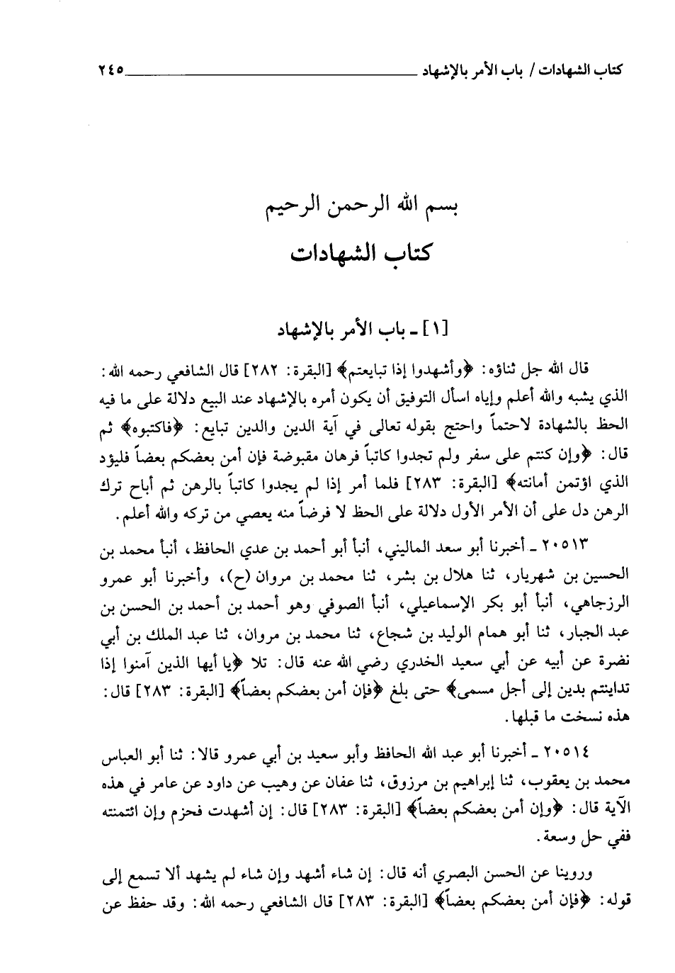 20514 - أَخْبَرَنَا أَبُو عَبْدِ اللهِ الْحَافِظُ , وَأَبُو سَعِيدِ بْنُ أَبِي عَمْرٍو قَالَا: ثنا أَبُو الْعَبَّاسِ مُحَمَّدُ بْنُ يَعْقُوبَ , ثنا إِبْرَاهِيمُ بْنُ مَرْزُوقٍ , ثنا عَفَّانُ , عَنْ وُهَيْبٍ , عَنْ دَاوُدَ , عَنْ عَامِرٍ، فِي هَذِهِ الْآيَةِ قَالَ: {§فَإِنْ أَمِنَ بَعْضُكُمْ بَعْضًا} [البقرة: 283] قَالَ: إِنْ أَشَهَدْتَ فَحَزْمٌ , وَإِنِ ائْتَمَنْتَهُ فَفِي حِلٍّ وَسَعَةٍ ". وَرُوِّينَا عَنِ الْحَسَنِ الْبَصْرِيِّ أَنَّهُ قَالَ: إِنْ شَاءَ أَشْهَدَ , وَإِنْ شَاءَ لَمْ يَشْهَدْ , أَلَا تَسْمَعُ إِلَى قَوْلِهِ: {فَإِنْ أَمِنَ بَعْضُكُمْ بَعْضًا} [البقرة: 283]؟ قَالَ الشَّافِعِيُّ رَحِمَهُ اللهُ: " وَقَدْ حُفِظَ عَنِ -[246]- النَّبِيِّ صَلَّى اللهُ عَلَيْهِ وَسَلَّمَ أَنَّهُ بَايَعَ أَعْرَابِيًّا فِي فَرَسٍ فَجَحَدَ الْأَعْرَابِيُّ بِأَمْرِ بَعْضِ الْمُنَافِقِينَ , وَلَمْ يَكُنْ بَيْنَهُمَا بَيِّنَةٌ "