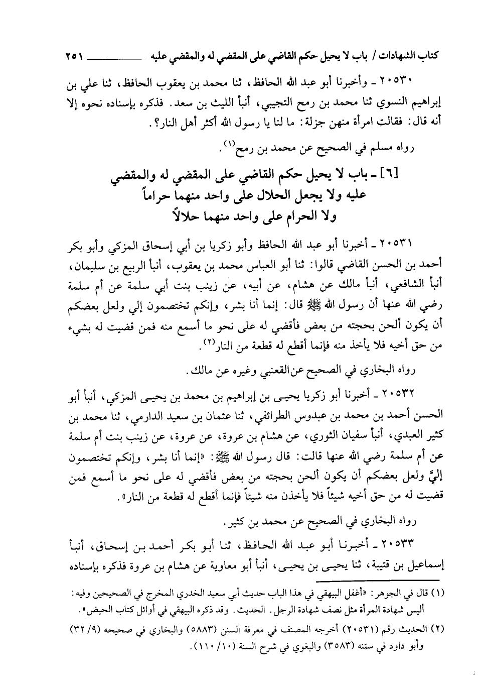 20531 - أَخْبَرَنَا أَبُو عَبْدِ اللهِ الْحَافِظُ , وَأَبُو زَكَرِيَّا بْنُ أَبِي إِسْحَاقَ الْمُزَكِّي , وَأَبُو بَكْرٍ أَحْمَدُ بْنُ الْحَسَنِ الْقَاضِي قَالُوا: ثنا أَبُو الْعَبَّاسِ مُحَمَّدُ بْنُ يَعْقُوبَ , أنبأ الرَّبِيعُ بْنُ سُلَيْمَانَ , أنبأ الشَّافِعِيُّ , أنبأ مَالِكٌ , عَنْ هِشَامٍ , عَنْ أَبِيهِ , عَنْ زَيْنَبَ بِنْتِ أَبِي سَلَمَةَ , عَنْ أُمِّ سَلَمَةَ، رَضِيَ اللهُ عَنْهَا أَنَّ رَسُولَ اللهِ صَلَّى اللهُ عَلَيْهِ وَسَلَّمَ قَالَ: §" إِنَّمَا أَنَا بَشَرٌ , وَإِنَّكُمْ تَخْتَصِمُونَ إِلِيَّ , وَلَعَلَّ بَعْضَكُمْ أَنْ يَكُونَ أَلْحَنَ بِحُجَّتِهِ مِنْ بَعْضٍ , فَأَقْضِيَ لَهُ عَلَى نَحْوِ مَا أَسْمَعُ مِنْهُ , فَمَنْ قَضَيْتُ لَهُ بِشَيْءٍ مِنْ حَقِّ أَخِيهِ فَلَا يَأْخُذْ مِنْهُ , فَإِنَّمَا أَقْطَعُ لَهُ قِطْعَةً مِنَ النَّارِ ". رَوَاهُ الْبُخَارِيُّ فِي الصَّحِيحِ , عَنِ الْقَعْنَبِيِّ وَغَيْرِهِ , عَنْ مَالِكٍ