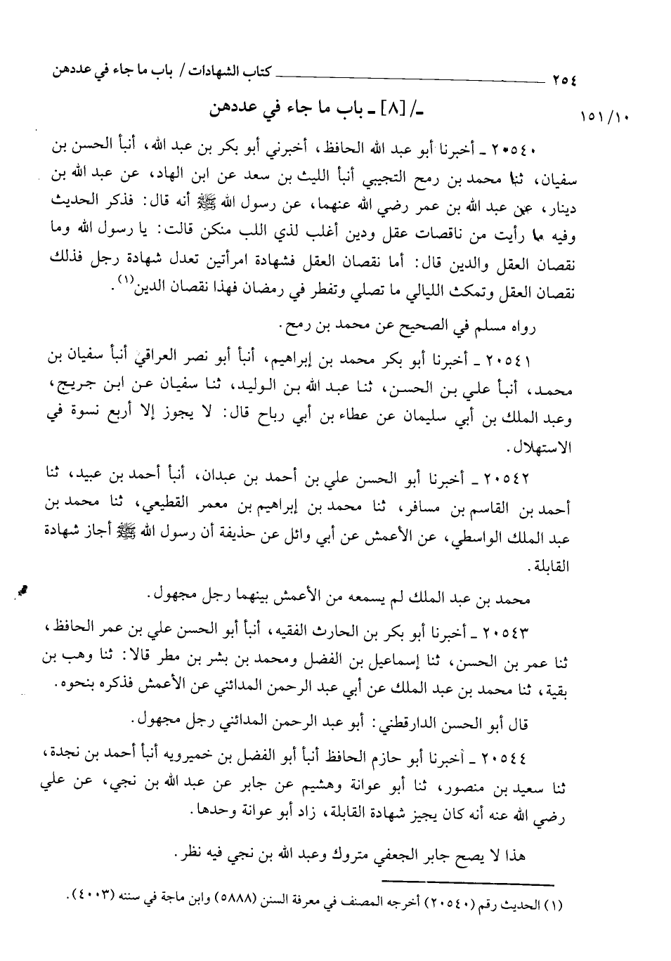 20540 - أَخْبَرَنَا أَبُو عَبْدِ اللهِ الْحَافِظُ , أَخْبَرَنِي أَبُو بَكْرِ بْنُ عَبْدِ اللهِ , أنبأ الْحَسَنُ بْنُ سُفْيَانَ , ثنا مُحَمَّدُ بْنُ رُمْحٍ التُّجِيبِيُّ , أنبأ اللَّيْثُ بْنُ سَعْدٍ , عَنِ ابْنِ الْهَادِ , عَنْ عَبْدِ اللهِ بْنِ دِينَارٍ , عَنْ عَبْدِ اللهِ بْنِ عُمَرَ، رَضِيَ اللهُ عَنْهُمَا , عَنْ رَسُولِ اللهِ صَلَّى اللهُ عَلَيْهِ وَسَلَّمَ أَنَّهُ قَالَ , فَذَكَرَ الْحَدِيثَ وَفِيهِ: §" مَا رَأَيْتُ مِنْ نَاقِصَاتِ عَقْلٍ وَدِينٍ أَغْلَبَ لِذِي اللُّبِ مِنْكُنَّ " , قَالَتْ: يَا رَسُولَ اللهِ , وَمَا نُقْصَانُ الْعَقْلِ وَالدِّينِ؟ قَالَ: " أَمَّا نُقْصَانُ الْعَقْلِ فَشَهَادَةُ امْرَأَتَيْنِ تَعْدِلُ شَهَادَةَ رَجُلٍ , فَذَلِكَ نُقْصَانُ الْعَقْلِ , وَتَمْكُثُ اللَّيَالِيَ مَا تُصَلِّي , وَتُفْطِرُ فِي رَمَضَانَ , فَهَذَا نُقْصَانُ الدِّينِ ". رَوَاهُ مُسْلِمٌ فِي الصَّحِيحِ , عَنْ مُحَمَّدِ بْنِ رُمْحٍ