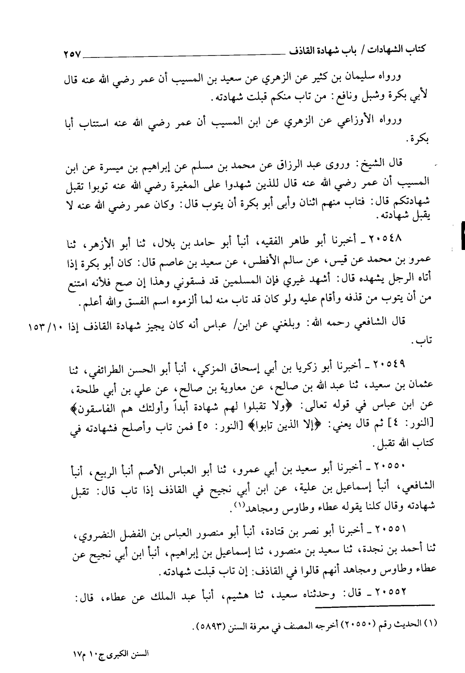 20551 - أَخْبَرَنَا أَبُو نَصْرِ بْنُ قَتَادَةَ , أنبأ أَبُو مَنْصُورٍ الْعَبَّاسُ بْنُ الْفَضْلِ النَّضْرَوِيُّ , ثنا أَحْمَدُ بْنُ نَجْدَةَ , ثنا سَعِيدُ بْنُ مَنْصُورٍ , ثنا إِسْمَاعِيلُ بْنُ إِبْرَاهِيمَ , أنبأ ابْنُ أَبِي نَجِيحٍ , عَنْ عَطَاءٍ , وَطَاوُسٍ , وَمُجَاهِدٍ , أَنَّهُمْ قَالُوا فِي الْقَاذِفِ§: إِنْ تَابَ , قُبِلَتْ شَهَادَتُهُ "
