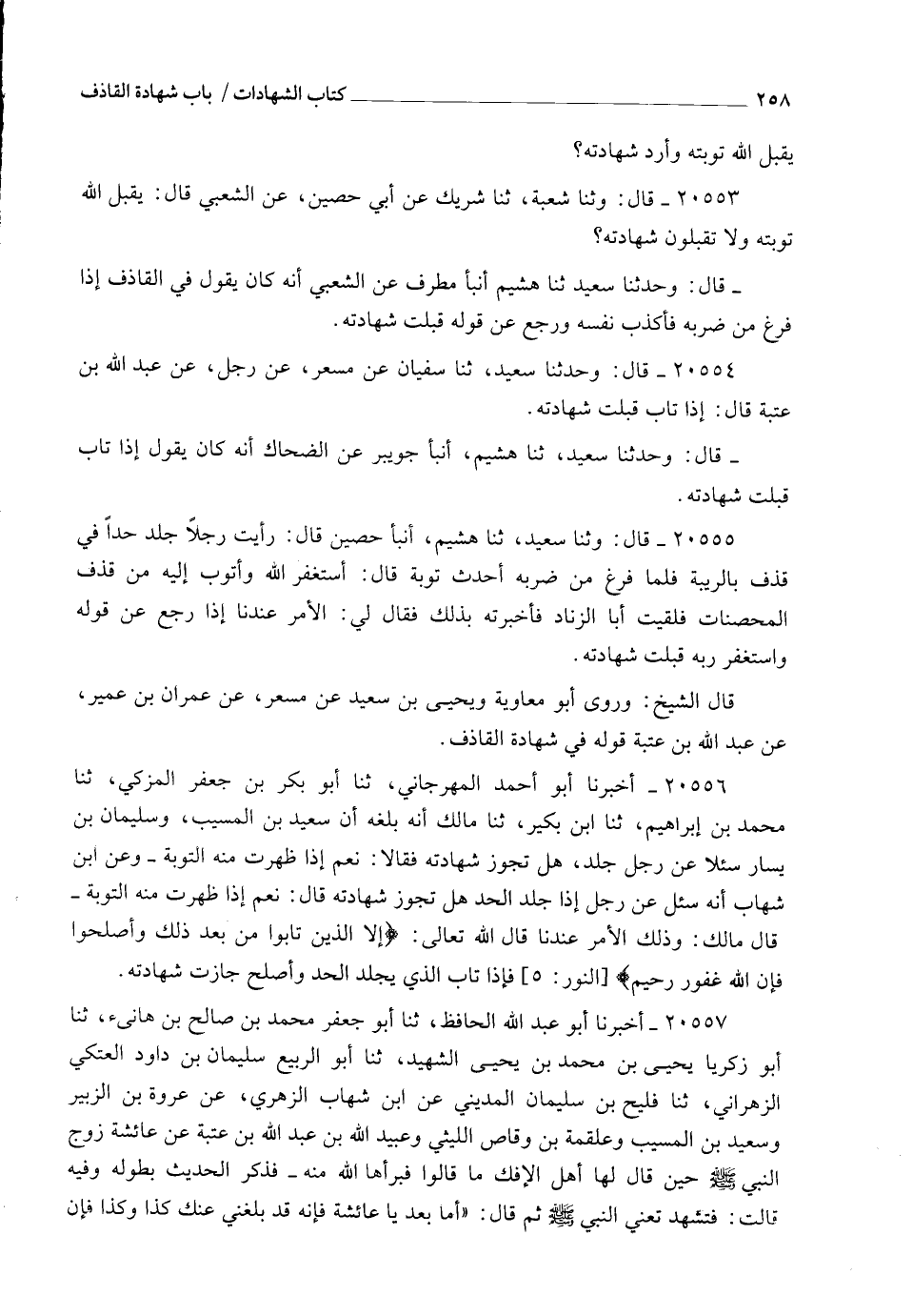 20555 - قَالَ: وَثَنَا سَعِيدٌ , ثنا هُشَيْمٌ , أنبأ حُصَيْنٌ، قَالَ: رَأَيْتُ رَجُلًا جُلِدَ حَدًّا فِي قَذْفٍ بِالرِّيبَةِ , فَلَمَّا فُرِغَ مِنْ ضَرْبِهِ أَحْدَثَ تَوْبَةً , قَالَ: أَسْتَغْفِرُ اللهَ , وَأَتُوبُ إِلَيْهِ مِنْ قَذْفِ الْمُحْصَنَاتِ , فَلَقِيتُ أَبَا الزِّنَادِ فَأَخْبَرْتُهُ بِذَلِكَ , فَقَالَ لِي: §" الْأَمْرُ عِنْدَنَا إِذَا رَجَعَ عَنْ قَوْلِهِ وَاسْتَغْفَرَ رَبَّهُ , قُبِلَتْ شَهَادَتُهُ " قَالَ الشَّيْخُ: " وَرَوَى أَبُو مُعَاوِيَةَ , وَيَحْيَى بْنُ سَعِيدٍ , عَنْ مِسْعَرٍ , عَنْ عِمْرَانَ بْنِ عُمَيْرٍ , عَنْ عَبْدِ اللهِ بْنِ عُتْبَةَ قَوْلَهُ فِي شَهَادَةِ الْقَاذِفِ