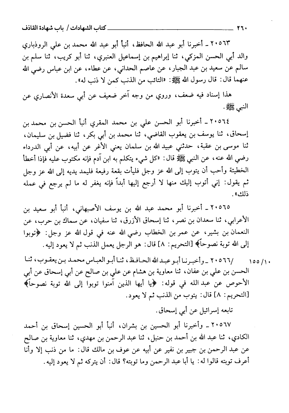 20563 - أَخْبَرَنَا أَبُو عَبْدِ اللهِ الْحَافِظُ , أنبأ أَبُو عَبْدِ اللهِ مُحَمَّدُ بْنُ عَلِيٍّ الرُّوذْبَارِيُّ , وَالِدُ أَبِي الْحَسَنِ الْمُزَكِّي , ثنا إِبْرَاهِيمُ بْنُ إِسْمَاعِيلَ الْعَنْبَرِيُّ , ثنا أَبُو كُرَيْبٍ , ثنا سَلْمُ بْنُ سَالِمٍ , عَنْ سَعِيدِ بْنِ عَبْدِ الْجَبَّارِ , عَنْ عَاصِمٍ الْحُدَّانِيِّ , عَنْ عَطَاءٍ , عَنِ ابْنِ عَبَّاسٍ رَضِيَ اللهُ عَنْهُمَا قَالَ: قَالَ رَسُولُ اللهِ صَلَّى اللهُ عَلَيْهِ وَسَلَّمَ: §" التَّائِبُ مِنَ الذَّنْبِ كَمَنْ لَا ذَنْبَ لَهُ ". هَذَا إِسْنَادٌ فِيهِ ضَعْفٌ , وَرُوِيَ مِنْ وَجْهٍ آخَرَ ضَعِيفٍ , عَنْ أَبِي سَعْدَةَ الْأَنْصَارِيِّ عَنِ النَّبِيِّ صَلَّى اللهُ عَلَيْهِ وَسَلَّمَ
