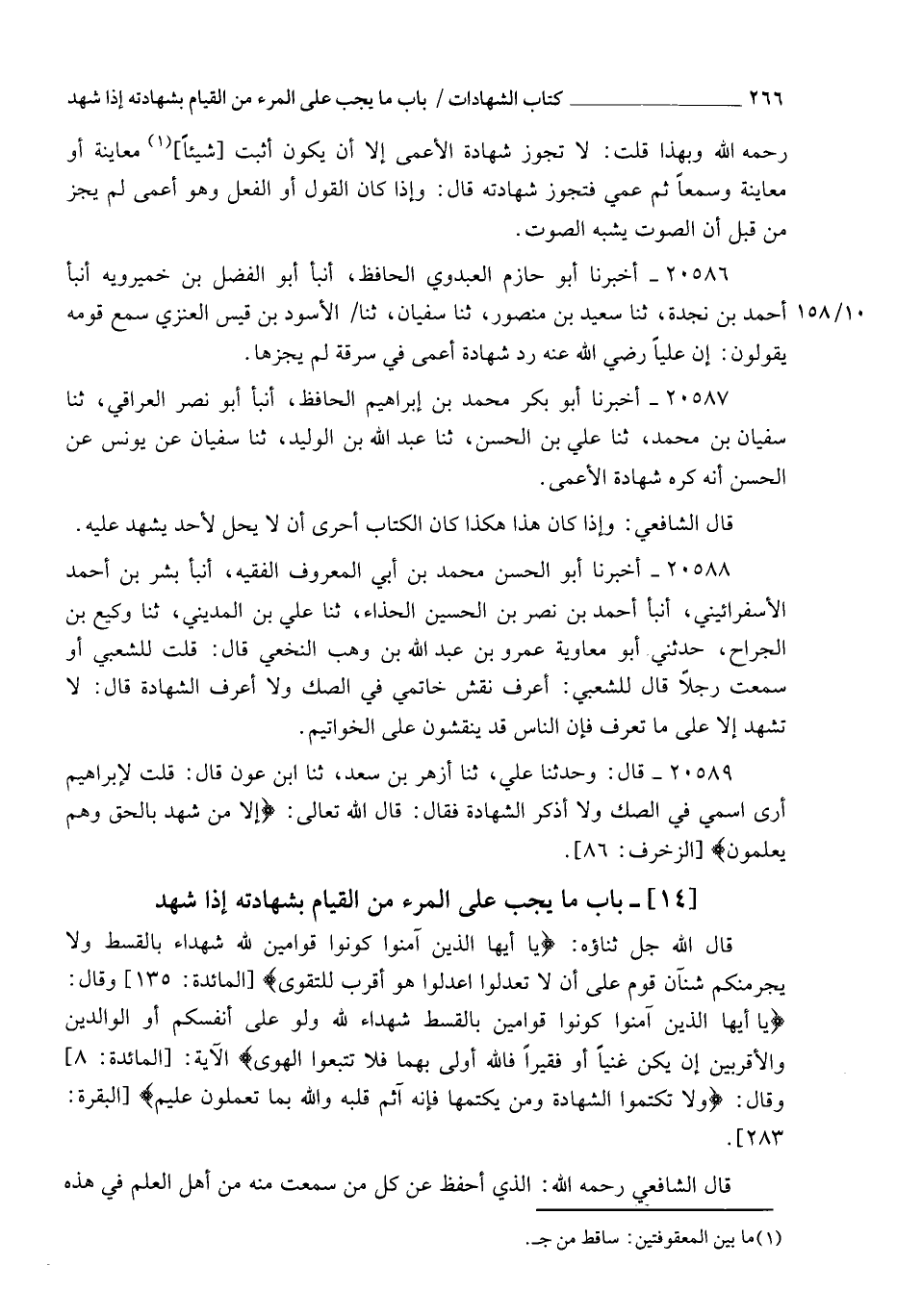 20587 - أَخْبَرَنَا أَبُو بَكْرٍ مُحَمَّدُ بْنُ إِبْرَاهِيمَ الْحَافِظُ , أنبأ أَبُو نَصْرٍ الْعِرَاقِيُّ , ثنا سُفْيَانُ بْنُ مُحَمَّدٍ , ثنا عَلِيُّ بْنُ الْحَسَنِ , ثنا عَبْدُ اللهِ بْنُ الْوَلِيدِ , ثنا سُفْيَانُ، عَنْ يُونُسَ، عَنِ الْحَسَنِ، أَنَّهُ §كَرِهَ شَهَادَةَ الْأَعْمَى. قَالَ الشَّافِعِيُّ: " وَإِذَا كَانَ هَذَا هَكَذَا , كَانَ الْكِتَابُ أَحْرَى أَنْ لَا يَحِلَّ لِأَحَدٍ يَشْهَدُ عَلَيْهِ "