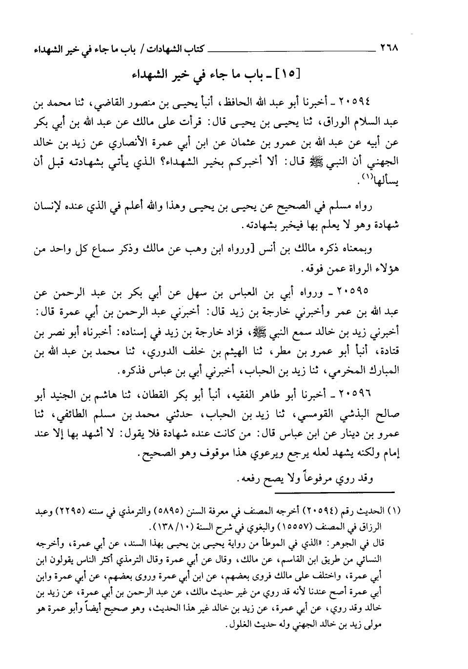 20594 - أَخْبَرَنَا أَبُو عَبْدِ اللهِ الْحَافِظُ , أنبأ يَحْيَى بْنُ مَنْصُورٍ الْقَاضِي , ثنا مُحَمَّدُ بْنُ عَبْدِ السَّلَامِ الْوَرَّاقُ , ثنا يَحْيَى بْنُ يَحْيَى، قَالَ: قَرَأْتُ عَلَى مَالِكٍ، عَنْ عَبْدِ اللهِ بْنِ أَبِي بَكْرٍ , عَنْ أَبِيهِ , عَنْ عَبْدِ اللهِ بْنِ عَمْرِو بْنِ عُثْمَانَ , عَنِ ابْنِ أَبِي عَمْرَةَ الْأَنْصَارِيِّ , عَنْ زَيْدِ بْنِ خَالِدٍ الْجُهَنِيِّ , أَنَّ النَّبِيَّ صَلَّى اللهُ عَلَيْهِ وَسَلَّمَ قَالَ: §" أَلَا أُخْبِرُكُمْ بِخَيْرِ الشُّهَدَاءِ؟ الَّذِي يَأْتِي بِشَهَادَتِهِ قَبْلَ أَنْ يُسْأَلَهَا " رَوَاهُ مُسْلِمٌ فِي الصَّحِيحِ، عَنْ يَحْيَى بْنِ يَحْيَى. وَهَذَا وَاللهُ أَعْلَمُ فِي الَّذِي عِنْدَهُ لِإِنْسَانٍ شَهَادَةٌ وَهُوَ لَا يَعْلَمُ بِهَا فَيُخْبِرُ بِشَهَادَتِهِ , وَبِمَعْنَاهُ ذَكَرَهُ مَالِكُ بْنُ أَنَسٍ , وَرَوَاهُ ابْنُ وَهْبٍ، عَنْ مَالِكٍ , وَذَكَرَ سَمَاعَ كُلِّ وَاحِدٍ مِنْ هَؤُلَاءِ الرُّوَاةِ عَمَّنْ فَوْقَهُ "
