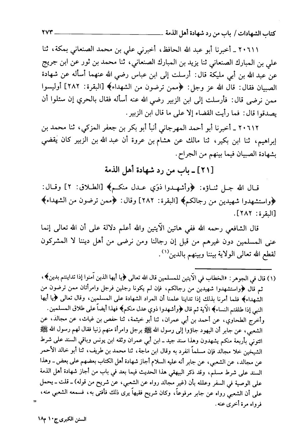 20611 - أَخْبَرَنَا أَبُو عَبْدِ اللهِ الْحَافِظُ , أَخْبَرَنِي عَلِيُّ بْنُ مُحَمَّدٍ الصَّنْعَانِيُّ، بِمَكَّةَ , ثنا عَلِيُّ بْنُ الْمُبَارَكِ الصَّنْعَانِيُّ , ثنا يَزِيدُ بْنُ الْمُبَارَكِ الصَّنْعَانِيُّ , ثنا مُحَمَّدُ بْنُ ثَوْرٍ , عَنِ ابْنِ جُرَيْجٍ , عَنْ عَبْدِ اللهِ بْنِ أَبِي مُلَيْكَةَ، قَالَ: §أَرْسَلْتُ إِلَى ابْنِ عَبَّاسٍ رَضِيَ اللهُ عَنْهُمَا أَسْأَلُهُ عَنْ شَهَادَةِ الصِّبْيَانِ , فَقَالَ: " قَالَ اللهُ عَزَّ وَجَلَّ: {مِمَّنْ تَرْضَوْنَ مِنَ الشُّهَدَاءِ} [البقرة: 282] وَلَيْسُوا مِمَّنْ نَرْضَى " , قَالَ: فَأَرْسَلْتُ إِلَى ابْنِ الزُّبَيْرِ رَضِيَ اللهُ عَنْهُ أَسْأَلُهُ , فَقَالَ: " بِالْحَرِيِّ إِنْ سُئِلُوا أَنْ يَصْدُقُوا " , قَالَ: فَمَا رَأَيْتُ الْقَضَاءَ إِلَّا عَلَى مَا قَالَ ابْنُ الزُّبَيْرِ "
