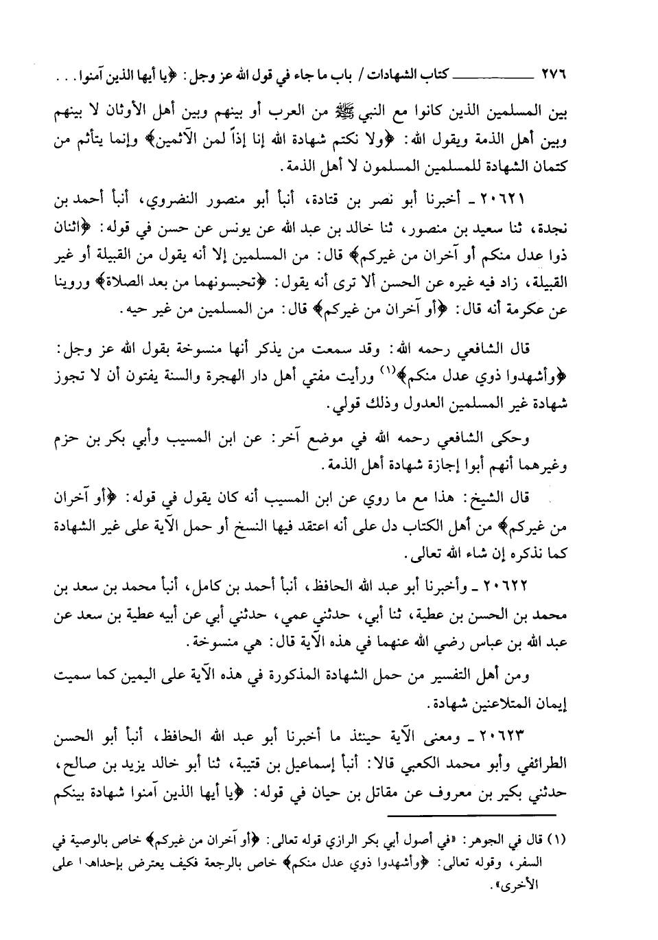 20621 - أَخْبَرَنَا أَبُو نَصْرِ بْنُ قَتَادَةَ , أنبأ أَبُو مَنْصُورٍ النَّضْرَوِيُّ , أنبأ أَحْمَدُ بْنُ نَجْدَةَ , ثنا سَعِيدُ بْنُ مَنْصُورٍ , ثنا خَالِدُ بْنُ عَبْدِ اللهِ , عَنْ يُونُسَ , عَنِ الْحَسَنِ، فِي قَوْلِهِ: {§اثْنَانِ ذَوَا عَدْلٍ مِنْكُمْ أَوْ آخَرَانِ مِنْ غَيْرِكُمْ} [المائدة: 106] قَالَ: " مِنَ الْمُسْلِمِينَ , إِلَّا أَنَّهُ يَقُولُ: مِنَ الْقَبِيلَةِ أَوْ غَيْرِ الْقَبِيلَةِ " , زَادَ فِيهِ غَيْرُهُ عَنِ الْحَسَنِ: " أَلَا تَرَى أَنَّهُ يَقُولُ: " تَحْبِسُونَهُمَا مِنْ بَعْدِ الصَّلَاةِ " , وَرُوِّينَا، عَنْ عِكْرِمَةَ أَنَّهُ قَالَ: " {أَوْ آخَرَانِ مِنْ غَيْرِكُمْ} [المائدة: 106] قَالَ: " مِنَ الْمُسْلِمِينَ مِنْ غَيْرِ حَيِّهِ ". قَالَ الشَّافِعِيُّ رَحِمَهُ اللهُ: وَقَدْ سَمِعْتُ مَنْ يَذْكُرُ أَنَّهَا مَنْسُوخَةٌ بِقَوْلِ اللهِ عَزَّ وَجَلَّ: {وَأَشْهِدُوا ذَوَيْ عَدْلٍ مِنْكُمْ} [الطلاق: 2] وَرَأَيْتُ مُفْتِيَّ أَهْلِ دَارِ الْهِجْرَةِ وَالسُّنَّةِ يُفْتُونَ أَنْ لَا تَجُوزَ شَهَادَةُ غَيْرِ الْمُسْلِمِينَ الْعُدُولِ , وَذَلِكَ قَوْلِي. وَحَكَى الشَّافِعِيُّ رَحِمَهُ اللهُ فِي مَوْضِعٍ آخَرَ، عَنِ ابْنِ الْمُسَيِّبِ , وَأَبِي بَكْرِ بْنِ حَزْمٍ , وَغَيْرِهِمَا أَنَّهُمْ أَبَوْا إِجَازَةَ شَهَادَةِ أَهْلِ الذِّمَّةِ قَالَ الشَّيْخُ: هَذَا مَعَ مَا رُوِيَ عَنِ ابْنِ الْمُسَيِّبِ أَنَّهُ كَانَ يَقُولُ فِي قَوْلِهِ: {أَوْ آخَرَانِ مِنْ غَيْرِكُمْ} [المائدة: 106] مِنْ أَهْلِ الْكِتَابِ , دَلَّ عَلَى أَنَّهُ اعْتَقَدَ فِيهَا النَّسْخَ أَوْ حَمَلَ الْآيَةَ عَلَى غَيْرِ الشَّهَادَةِ , كَمَا نَذْكُرُهُ إِنْ شَاءَ اللهُ تَعَالَى.