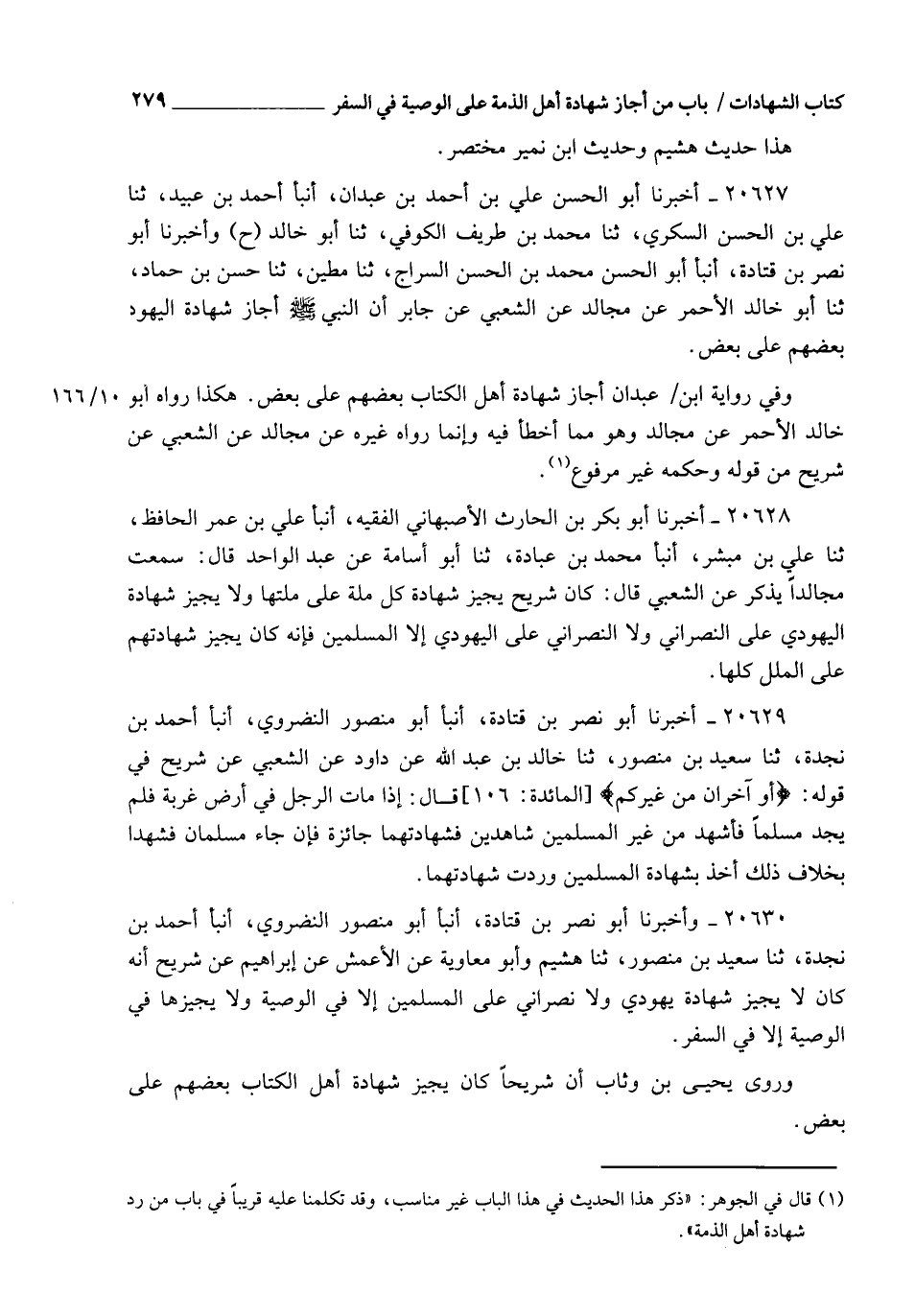 20630 - وَأَخْبَرَنَا أَبُو نَصْرِ بْنُ قَتَادَةَ , أنبأ أَبُو مَنْصُورٍ النَّضْرَوِيُّ , أنبأ أَحْمَدُ بْنُ نَجْدَةَ , ثنا سَعِيدُ بْنُ مَنْصُورٍ , ثنا هُشَيْمٌ , وَأَبُو مُعَاوِيَةَ، عَنِ الْأَعْمَشِ , عَنْ إِبْرَاهِيمَ , عَنْ شُرَيْحٍ، أَنَّهُ: §" كَانَ لَا يُجِيزُ شَهَادَةَ يَهُودِيٍّ وَلَا نَصْرَانِيٍّ عَلَى الْمُسْلِمِينَ , إِلَّا فِي الْوَصِيَّةِ , وَلَا يُجِيزُهَا فِي الْوَصِيَّةِ إِلَّا فِي السَّفَرِ ". وَرَوَى يَحْيَى بْنُ وَثَّابٍ أَنَّ شُرَيْحًا كَانَ يُجِيزُ شَهَادَةَ أَهْلِ الْكِتَابِ بَعْضِهِمْ عَلَى بَعْضٍ