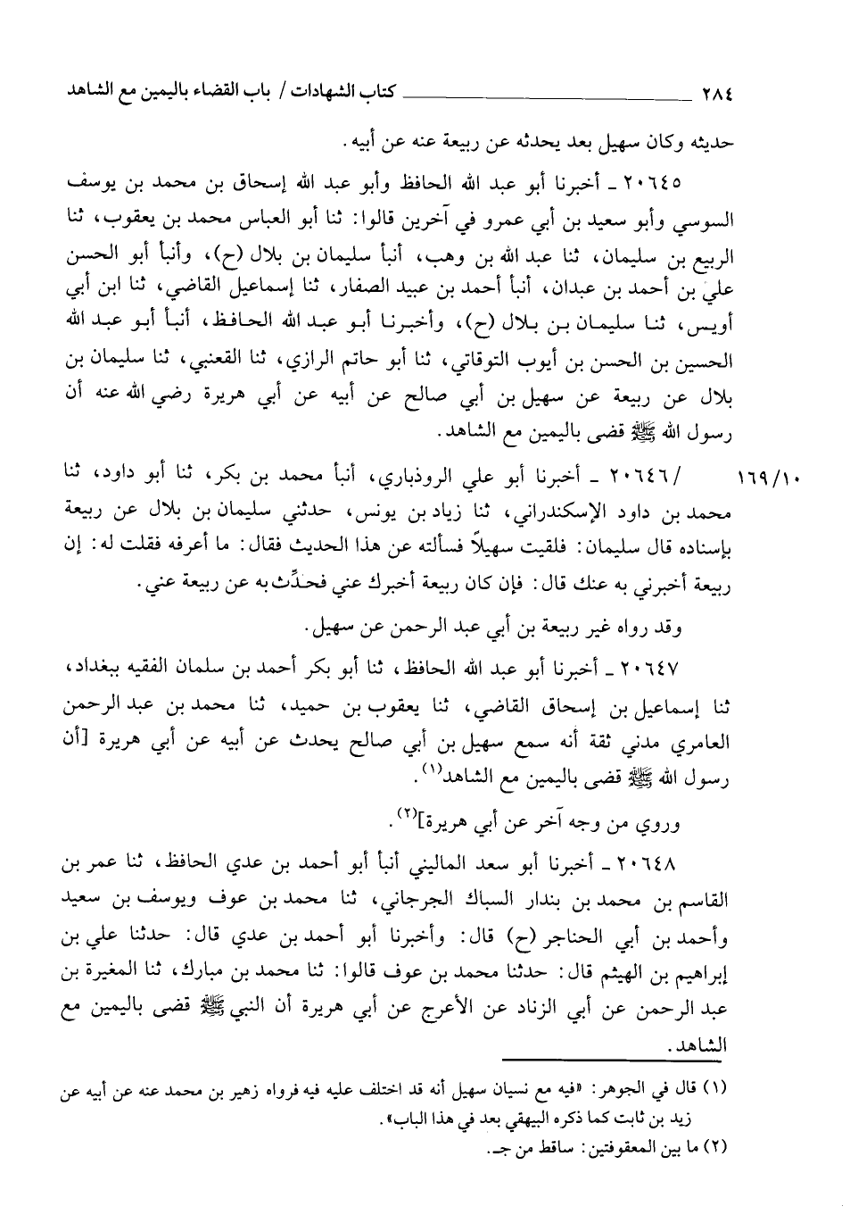 20645 - أَخْبَرَنَا أَبُو عَبْدِ اللهِ الْحَافِظُ , وَأَبُو عَبْدِ اللهِ إِسْحَاقُ بْنُ مُحَمَّدِ بْنِ يُوسُفَ السُّوسِيُّ , وَأَبُو سَعِيدِ بْنُ أَبِي عَمْرٍو فِي آخَرِينَ قَالُوا: ثنا أَبُو الْعَبَّاسِ مُحَمَّدُ بْنُ يَعْقُوبَ , ثنا الرَّبِيعُ بْنُ سُلَيْمَانَ , ثنا عَبْدُ اللهِ بْنُ وَهْبٍ , أنبأ سُلَيْمَانُ بْنُ بِلَالٍ ح وَأنبأ أَبُو الْحَسَنِ عَلِيُّ بْنُ أَحْمَدَ بْنِ عَبْدَانَ , أنبأ أَحْمَدُ بْنُ عُبَيْدٍ الصَّفَّارُ , ثنا إِسْمَاعِيلُ الْقَاضِي , ثنا ابْنُ أَبِي أُوَيْسٍ , ثنا سُلَيْمَانُ بْنُ بِلَالٍ، ح، وَأَخْبَرَنَا أَبُو عَبْدِ اللهِ الْحَافِظُ , أنبأ أَبُو عَبْدِ اللهِ الْحُسَيْنُ بْنُ الْحَسَنِ بْنِ أَيُّوبَ التُّوقَاتِيُّ , ثنا أَبُو حَاتِمٍ الرَّازِيُّ , ثنا الْقَعْنَبِيُّ , ثنا سُلَيْمَانُ بْنُ بِلَالٍ , عَنْ رَبِيعَةَ , عَنْ سُهَيْلِ بْنِ أَبِي صَالِحٍ , عَنْ أَبِيهِ , عَنْ أَبِي هُرَيْرَةَ، رَضِيَ اللهُ عَنْهُ أَنَّ رَسُولَ اللهِ صَلَّى اللهُ عَلَيْهِ وَسَلَّمَ: §" قَضَى بِالْيَمِينِ مَعَ الشَّاهِدِ "