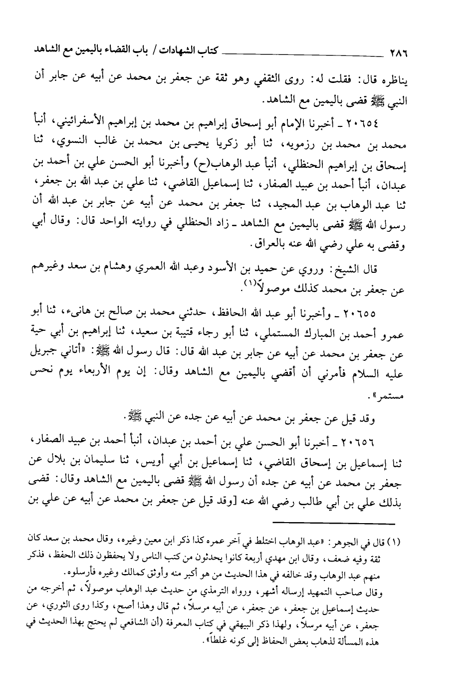 20654 - أَخْبَرَنَا الْإِمَامُ أَبُو إِسْحَاقَ إِبْرَاهِيمُ بْنُ مُحَمَّدِ بْنِ إِبْرَاهِيمَ الْإِسْفرَاينِيُّ , أنبأ مُحَمَّدُ بْنُ مُحَمَّدِ بْنِ رَزْمَوَيْهِ , ثنا أَبُو زَكَرِيَّا يَحْيَى بْنُ مُحَمَّدِ بْنِ غَالِبٍ النَّسَوِيُّ , ثنا إِسْحَاقُ بْنُ إِبْرَاهِيمَ الْحَنْظَلِيُّ , أنبأ عَبْدُ الْوَهَّابِ ح وَأَخْبَرَنَا أَبُو الْحَسَنِ عَلِيُّ بْنُ أَحْمَدَ بْنِ عَبْدَانَ , أنبأ أَحْمَدُ بْنُ عُبَيْدٍ الصَّفَّارُ , ثنا إِسْمَاعِيلُ الْقَاضِي , ثنا عَلِيُّ بْنُ عَبْدِ اللهِ بْنِ جَعْفَرٍ , ثنا عَبْدُ الْوَهَّابِ بْنُ عَبْدِ الْمَجِيدِ , ثنا جَعْفَرُ بْنُ مُحَمَّدٍ , عَنْ أَبِيهِ , عَنْ جَابِرِ بْنِ عَبْدِ اللهِ , أَنَّ رَسُولَ اللهِ صَلَّى اللهُ عَلَيْهِ وَسَلَّمَ: " §قَضَى بِالْيَمِينِ مَعَ الشَّاهِدِ " زَادَ الْحَنْظَلِيُّ فِي رِوَايَتِهِ: " الْوَاحِدِ " قَالَ: وَقَالَ أَبِي: وَقَضَى بِهِ عَلِيٌّ رَضِيَ اللهُ عَنْهُ بِالْعِرَاقِ. قَالَ الشَّيْخُ: " وَرُوِيَ عَنْ حُمَيْدِ بْنِ الْأَسْوَدِ , وَعَبْدِ اللهِ الْعُمَرِيِّ , وَهِشَامِ بْنِ سَعْدٍ وَغَيْرِهِمْ، عَنْ جَعْفَرِ بْنِ مُحَمَّدٍ كَذَلِكَ مَوْصُولًا "