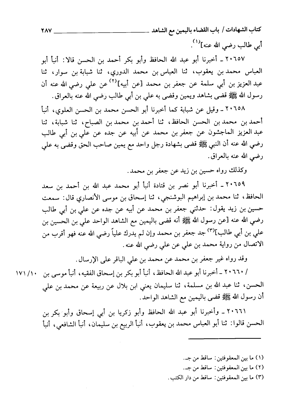 20659 - أَخْبَرَنَا أَبُو نَصْرِ بْنُ قَتَادَةَ , أنبأ أَبُو مُحَمَّدٍ عَبْدُ اللهِ بْنُ أَحْمَدَ بْنِ سَعْدٍ الْحَافِظُ , ثنا مُحَمَّدُ بْنُ إِبْرَاهِيمَ الْبُوشَنْجِيُّ , ثنا إِسْحَاقُ بْنُ مُوسَى الْأَنْصَارِيُّ، قَالَ: سَمِعْتُ حُسَيْنَ بْنَ زَيْدٍ يَقُولُ: حَدَّثَنِي جَعْفَرُ بْنُ مُحَمَّدٍ , عَنْ أَبِيهِ , عَنْ جَدِّهِ , عَنْ عَلِيِّ بْنِ أَبِي طَالِبٍ، رَضِيَ اللهُ عَنْهُ، عَنْ رَسُولِ اللهِ صَلَّى اللهُ عَلَيْهِ وَسَلَّمَ أَنَّهُ: §" قَضَى بِالْيَمِينِ مَعَ الشَّاهِدِ الْوَاحِدِ " عَلِيُّ بْنُ الْحُسَيْنِ بْنِ عَلِيِّ بْنِ أَبِي طَالِبٍ جَدُّ جَعْفَرِ بْنِ مُحَمَّدٍ , وَإِنْ لَمْ يُدْرِكْ عَلِيًّا رَضِيَ اللهُ عَنْهُ , فَهُوَ أَقْرَبُ مِنَ الِاتِّصَالِ مِنْ رِوَايَةِ مُحَمَّدِ بْنِ عَلِيٍّ، عَنْ عَلِيٍّ رَضِيَ اللهُ عَنْهُ , وَقَدْ رَوَاهُ غَيْرُ جَعْفَرِ بْنِ مُحَمَّدٍ، عَنْ مُحَمَّدِ بْنِ عَلِيٍّ الْبَاقِرِ عَلَى الْإِرْسَالِ