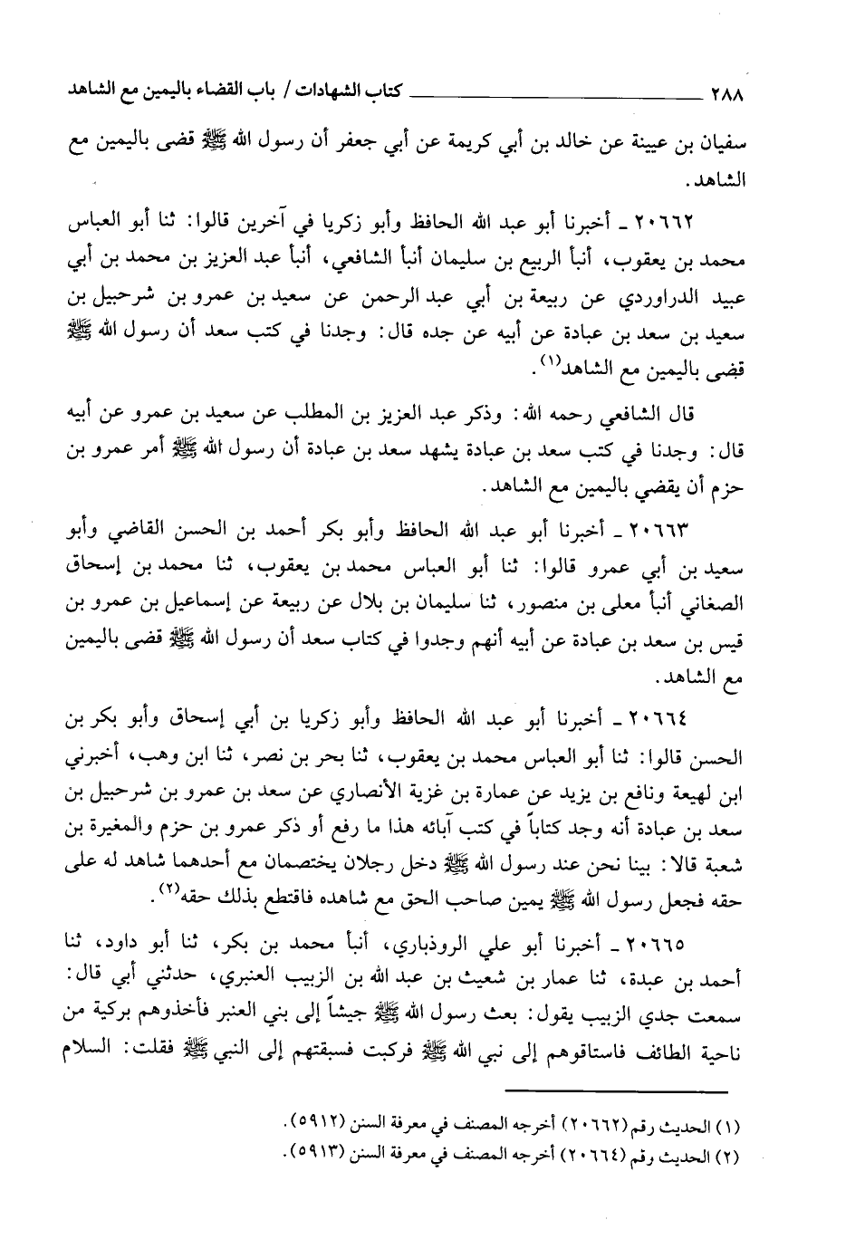 20662 - أَخْبَرَنَا أَبُو عَبْدِ اللهِ الْحَافِظُ , وَأَبُو زَكَرِيَّا فِي آخَرِينَ قَالُوا: ثنا أَبُو الْعَبَّاسِ مُحَمَّدُ بْنُ يَعْقُوبَ , أنبأ الرَّبِيعُ بْنُ سُلَيْمَانَ , أنبأ الشَّافِعِيُّ , أنبأ عَبْدُ الْعَزِيزِ بْنُ مُحَمَّدِ بْنِ أَبِي عُبَيْدٍ الدَّرَاوَرْدِيُّ , عَنْ رَبِيعَةَ بْنِ أَبِي عَبْدِ الرَّحْمَنِ , عَنْ سَعِيدِ بْنِ عَمْرِو بْنِ شُرَحْبِيلَ بْنِ سَعِيدِ بْنِ سَعْدِ بْنِ عُبَادَةَ , عَنْ أَبِيهِ , عَنْ جَدِّهِ , قَالَ: وَجَدْنَا فِي كُتُبِ سَعْدٍ: أَنَّ رَسُولَ اللهِ صَلَّى اللهُ عَلَيْهِ وَسَلَّمَ: §" قَضَى بِالْيَمِينِ مَعَ الشَّاهِدِ ". قَالَ الشَّافِعِيُّ رَحِمَهُ اللهُ: وَذَكَرَ عَبْدُ الْعَزِيزِ بْنُ الْمُطَّلِبِ , عَنْ سَعِيدِ بْنِ عَمْرٍو , عَنْ أَبِيهِ قَالَ: وَجَدْنَا فِي كُتُبِ سَعْدِ بْنِ عُبَادَةَ: يَشْهَدُ سَعْدُ بْنُ عُبَادَةَ أَنَّ رَسُولَ اللهِ صَلَّى اللهُ عَلَيْهِ وَسَلَّمَ أَمَرَ عَمْرَو بْنَ حَزْمٍ أَنْ يَقْضِيَ بِالْيَمِينِ مَعَ الشَّاهِدِ "