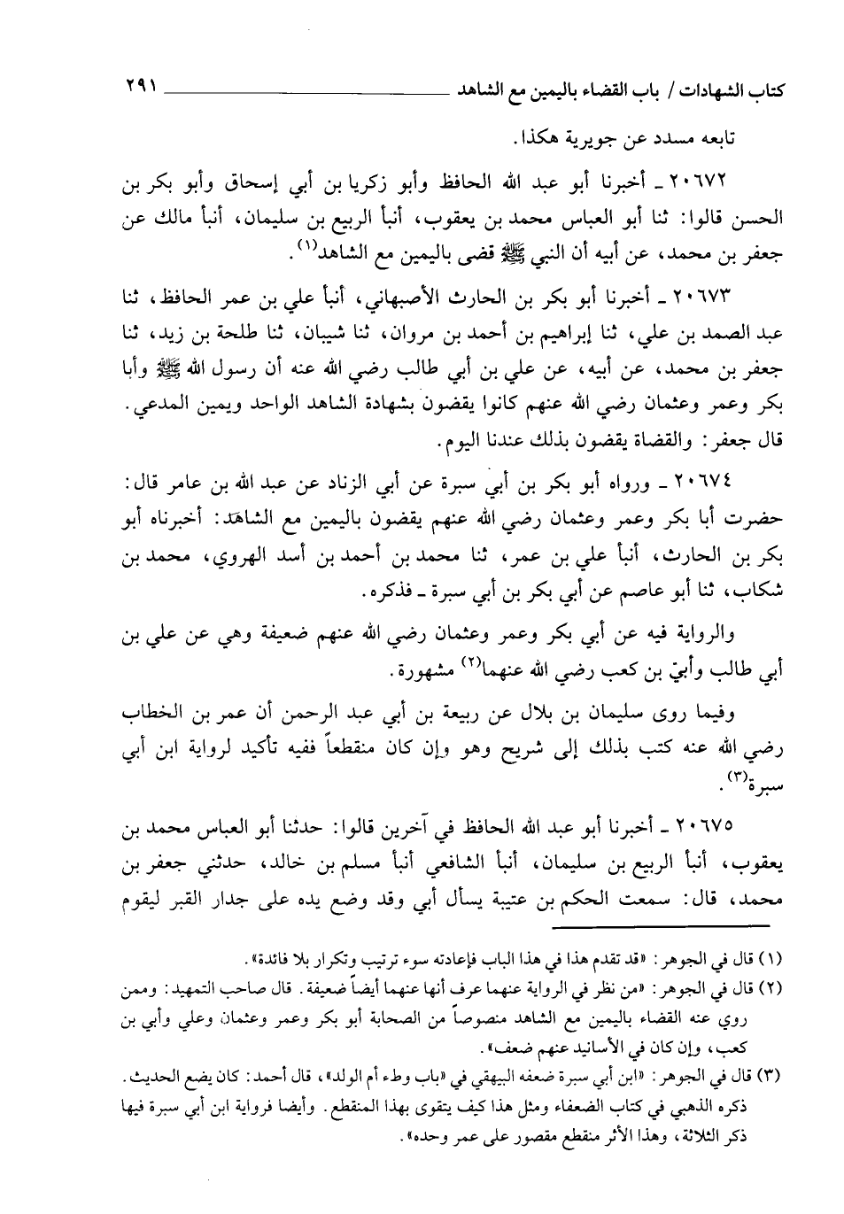 20673 - أَخْبَرَنَا أَبُو بَكْرِ بْنُ الْحَارِثِ الْأَصْبَهَانِيُّ , أنبأ عَلِيُّ بْنُ عُمَرَ الْحَافِظُ , ثنا عَبْدُ الصَّمَدِ بْنُ عَلِيٍّ , ثنا إِبْرَاهِيمُ بْنُ أَحْمَدَ بْنِ مَرْوَانَ , ثنا شَيْبَانُ , ثنا طَلْحَةُ بْنُ زَيْدٍ , ثنا جَعْفَرُ بْنُ مُحَمَّدٍ , عَنْ أَبِيهِ , عَنْ عَلِيِّ بْنِ أَبِي طَالِبٍ , رَضِيَ اللهُ عَنْهُ أَنَّ رَسُولَ اللهِ صَلَّى اللهُ عَلَيْهِ وَسَلَّمَ وَأَبَا بَكْرٍ وَعُمَرَ وَعُثْمَانَ رَضِيَ اللهُ عَنْهُمْ كَانُوا: §" يَقْضُونَ بِشَهَادَةِ الشَّاهِدِ الْوَاحِدِ وَيَمِينِ الْمُدَّعِي ". قَالَ جَعْفَرٌ: وَالْقُضَاةُ يَقْضُونَ بِذَلِكَ عِنْدَنَا الْيَوْمَ.