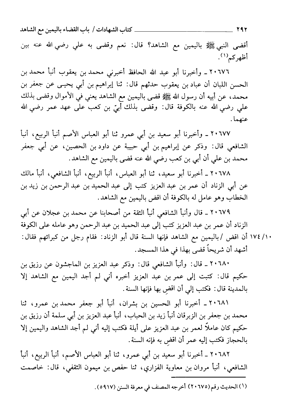 20678 - أَخْبَرَنَا أَبُو سَعِيدٍ , ثنا أَبُو الْعَبَّاسِ , أنبأ الرَّبِيعُ , أنبأ الشَّافِعِيُّ , أنبأ مَالِكٌ , عَنْ أَبِي الزِّنَادِ , أَنَّ عُمَرَ بْنَ عَبْدِ الْعَزِيزِ , كَتَبَ إِلَى عَبْدِ الْحَمِيدِ بْنِ عَبْدِ الرَّحْمَنِ بْنِ زَيْدِ بْنِ الْخَطَّابِ وَهُوَ عَامِلٌ لَهُ بِالْكُوفَةِ: " §أَنِ اقْضِ بِالْيَمِينِ مَعَ الشَّاهِدِ ".
