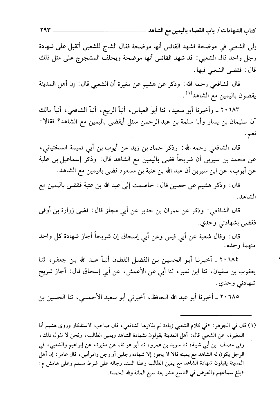 20683 - وَأَخْبَرَنَا أَبُو سَعِيدٍ , ثنا أَبُو الْعَبَّاسِ , أنبأ الرَّبِيعُ , أنبأ الشَّافِعِيُّ , أنبأ مَالِكٌ , أَنَّ سُلَيْمَانَ بْنَ يَسَارٍ , وَأَبَا سَلَمَةَ بْنَ عَبْدِ الرَّحْمَنِ §سُئِلَا: أَيُقْضَى بِالْيَمِينِ مَعَ الشَّاهِدِ؟ فَقَالَا: " نَعَمْ ". قَالَ الشَّافِعِيُّ رَحِمَهُ اللهُ: وَذَكَرَ حَمَّادُ بْنُ زَيْدٍ , عَنْ أَيُّوبَ بْنِ أَبِي تَمِيمَةَ السَّخْتِيَانِيِّ , عَنْ مُحَمَّدِ بْنِ سِيرِينَ أَنَّ شُرَيْحًا قَضَى بِالْيَمِينِ مَعَ الشَّاهِدِ , قَالَ: وَذَكَرَ إِسْمَاعِيلُ ابْنُ عُلَيَّةَ , عَنْ أَيُّوبَ , عَنِ ابْنِ سِيرِينَ، أَنَّ عَبْدَ اللهِ بْنَ عُتْبَةَ بْنِ مَسْعُودٍ قَضَى بِالْيَمِينِ مَعَ الشَّاهِدِ , قَالَ: وَذَكَرَ هُشَيْمٌ , عَنْ حُصَيْنٍ قَالَ: خَاصَمْتُ إِلَى عَبْدِ اللهِ بْنِ عُتْبَةَ فَقَضَى بِالْيَمِينِ مَعَ الشَّاهِدِ ". قَالَ الشَّافِعِيُّ: وَذُكِرَ عَنْ عِمْرَانَ بْنَ حُدَيْرٍ , عَنْ أَبِي مِجْلَزٍ قَالَ: قَضَى زُرَارَةُ بْنُ أَوْفَى , فَقَضَى بِشَهَادَتِي وَحْدِي " , قَالَ: وَقَالَ شُعْبَةُ , عَنْ أَبِي قَيْسٍ , وَعَنْ أَبِي إِسْحَاقَ أَنَّ شُرَيْحًا أَجَازَ شَهَادَةَ كُلِّ وَاحِدٍ مِنْهُمَا وَحْدَهُ