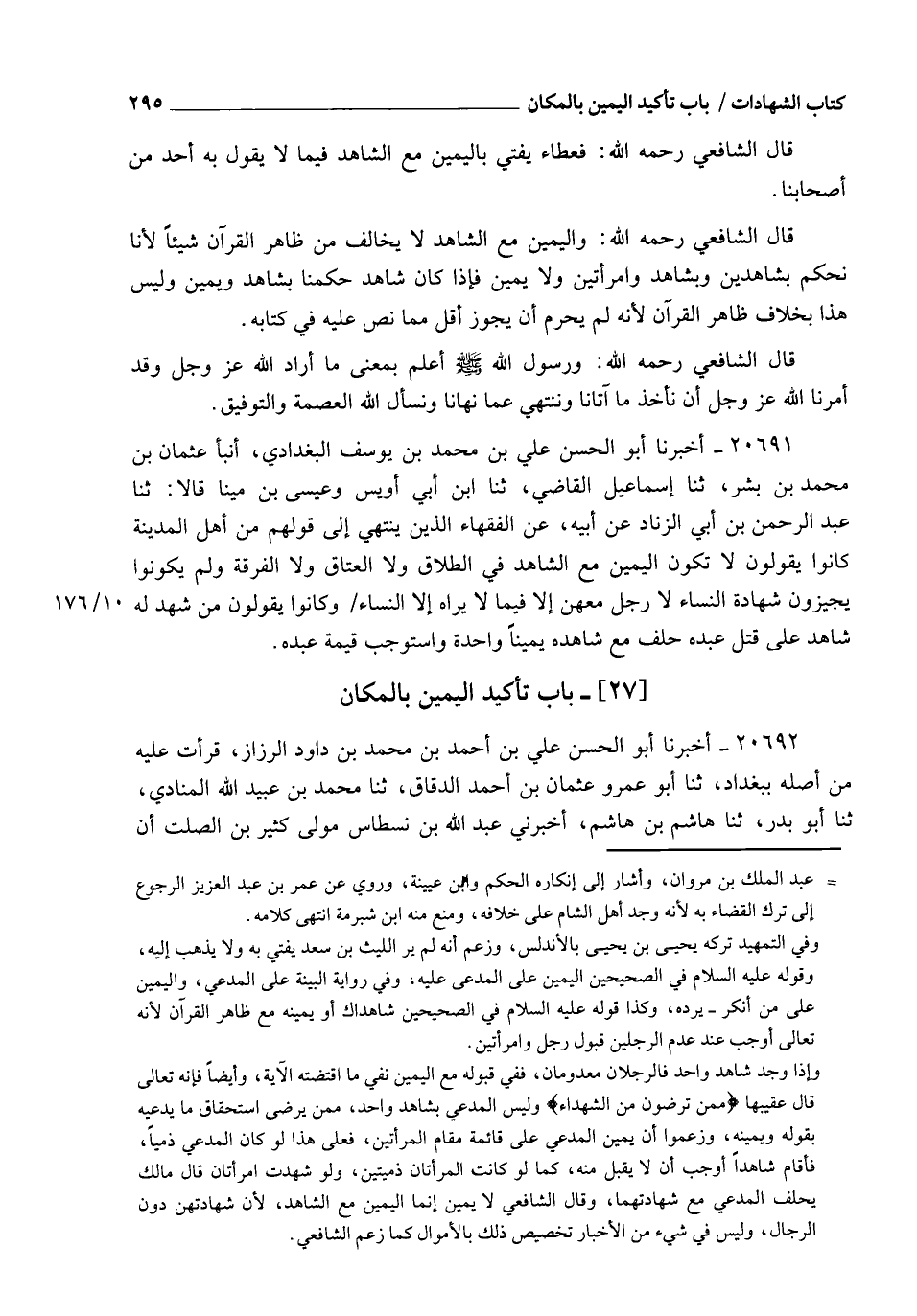 20691 - أَخْبَرَنَا أَبُو الْحَسَنِ عَلِيُّ بْنُ مُحَمَّدِ بْنِ يُوسُفَ الْبَغْدَادِيُّ , أنبأ عُثْمَانُ بْنُ مُحَمَّدِ بْنِ بِشْرٍ , ثنا إِسْمَاعِيلُ الْقَاضِي , ثنا ابْنُ أَبِي أُوَيْسٍ , وَعِيسَى بْنُ مِينَا , قَالَا: ثنا عَبْدُ الرَّحْمَنِ بْنُ أَبِي الزِّنَادِ , عَنْ أَبِيهِ , عَنِ الْفُقَهَاءِ الَّذِينَ يُنْتَهَى إِلَى قَوْلِهِمْ مِنْ أَهْلِ الْمَدِينَةِ كَانُوا يَقُولُونَ: §" لَا تَكُونُ الْيَمِينُ مَعَ الشَّاهِدِ فِي الطَّلَاقِ وَلَا الْعِتَاقِ وَلَا الْفُرْقَةِ " , وَلَمْ يَكُونُوا يُجِيزُونَ شَهَادَةَ النِّسَاءِ لَا رَجُلَ مَعَهُنَّ , إِلَّا فِيمَا لَا يَرَاهُ إِلَّا النِّسَاءُ , وَكَانُوا يَقُولُونَ: " مَنْ شَهِدَ لَهُ شَاهِدٌ عَلَى قَتْلِ عَبْدِهِ حَلَفَ مَعَ شَاهِدِهِ يَمِينًا وَاحِدَةً , وَاسْتَوْجَبَ قِيمَةَ عَبْدِهِ "