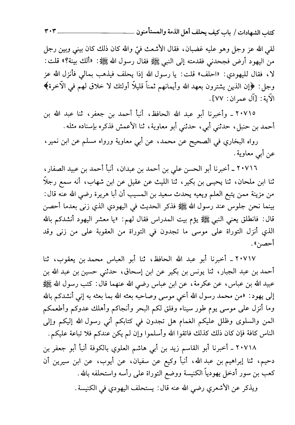 20718 - أَخْبَرَنَا أَبُو الْقَاسِمِ زَيْدُ بْنُ أَبِي هَاشِمٍ الْعَلَوِيُّ بِالْكُوفَةِ , أنبأ أَبُو جَعْفَرِ بْنُ دُحَيْمٍ , ثنا إِبْرَاهِيمُ بْنُ عَبْدِ اللهِ , أنبأ وَكِيعٌ , عَنْ سُفْيَانَ , عَنْ أَيُّوبَ , عَنِ ابْنِ سِيرِينَ ,§: أَنَّ كَعْبَ بْنَ سُورٍ , أَدْخَلَ يَهُودِيًّا الْكَنِيسَةَ وَوَضَعَ التَّوْرَاةَ عَلَى رَأْسِهِ وَاسْتَحْلَفَهُ بِاللهِ وَيُذْكَرُ عَنِ الْأَشْعَرِيِّ رَضِيَ اللهُ عَنْهُ قَالَ: " يُسْتَحْلَفُ الْيَهُودِيُّ فِي الْكَنِيسَةِ
