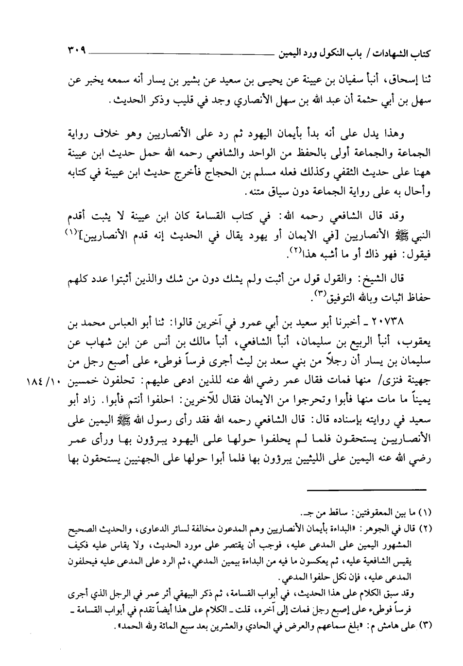 20738 - أَخْبَرَنَا أَبُو سَعِيدِ بْنُ أَبِي عَمْرٍو , فِي آخَرِينَ قَالُوا: ثنا أَبُو الْعَبَّاسِ مُحَمَّدُ بْنُ يَعْقُوبَ , أنبأ الرَّبِيعُ بْنُ سُلَيْمَانَ , أنبأ الشَّافِعِيُّ , أنبأ مَالِكُ بْنُ أَنَسٍ , عَنِ ابْنِ شِهَابٍ , عَنْ سُلَيْمَانَ بْنِ يَسَارٍ , أَنَّ رَجُلًا مِنْ بَنِي سَعْدِ بْنِ لَيْثٍ أَجْرَى فَرَسًا , فَوَطِئَ عَلَى إِصْبَعِ رَجُلٍ مِنْ جُهَيْنَةَ فَنَزَّى مِنْهَا فَمَاتَ , فَقَالَ عُمَرُ رَضِيَ اللهُ عَنْهُ لِلَّذِينَ ادُّعِيَ عَلَيْهِمْ: §" تَحْلِفُونَ خَمْسِينَ يَمِينًا مَا مَاتَ مِنْهَا؟ " , فَأَبَوْا وَتَحَرَّجُوا مِنَ الْأَيْمَانِ , فَقَالَ لِلْآخَرِينَ: " احْلِفُوا أَنْتُمْ " , فَأَبَوْا ". زَادَ أَبُو سَعِيدٍ فِي رِوَايَتِهِ بِإِسْنَادِهِ: قَالَ: قَالَ الشَّافِعِيُّ رَحِمَهُ اللهُ: فَقَدْ رَأَى رَسُولُ اللهِ صَلَّى اللهُ عَلَيْهِ وَسَلَّمَ الْيَمِينَ عَلَى الْأَنْصَارِيِّينِ يَسْتَحِقُّونَ , فَلَمَّا لَمْ يَحْلِفُوا حَوَّلَهَا عَلَى الْيَهُودِ يُبَرَّءُونَ بِهَا , وَرَأَى عُمَرُ رَضِيَ اللهُ عَنْهُ الْيَمِينَ عَلَى اللَّيْثِيِّينَ يُبَرَّءُونَ بِهَا , فَلَمَّا أَبَوْا حَوَّلَهَا عَلَى الْجُهَنِيِّينَ يَسْتَحِقُّونَ بِهَا , -[310]- فَكُلُّ هَذَا تَحْوِيلُ يَمِينٍ مِنْ مَوْضِعٍ قَدْ رُتِّبَتْ فِيهِ , إِلَى الْمَوْضِعِ الَّذِي يُخَالِفُهُ , فَبِهَذَا وَمَا أَدْرَكْنَا عَلَيْهِ أَهْلَ الْعِلْمِ بِبَلَدِنَا يَحْكُونَ عَنْ مُفْتِيهِمْ وَحُكَّامِهِمْ قَدِيمًا وَحَدِيثًا قُلْنَا فِي رَدِّ الْيَمِينِ