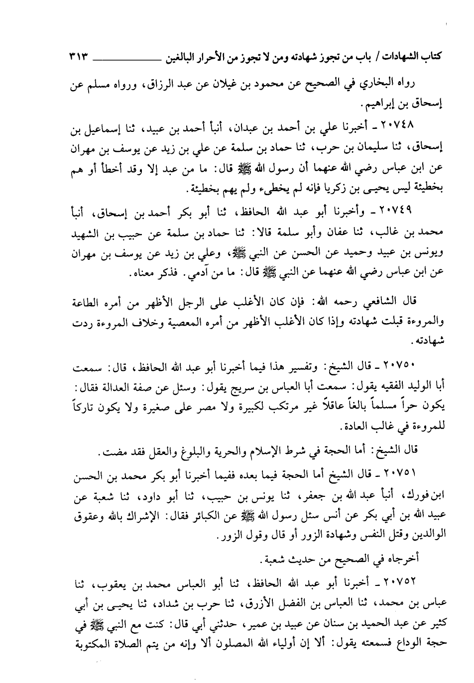 20750 - قَالَ الشَّيْخُ: وَتَفْسِيرُ هَذَا فِيمَا: أَخْبَرَنَا أَبُو عَبْدِ اللهِ الْحَافِظُ قَالَ: سَمِعْتُ أَبَا الْوَلِيدِ الْفَقِيهَ يَقُولُ: سَمِعْتُ أَبَا الْعَبَّاسِ بْنَ سُرَيْجٍ يَقُولُ , وَسُئِلَ عَنْ صِفَةِ الْعَدَالَةِ , فَقَالَ: يَكُونُ حُرًّا مُسْلِمًا بَالِغًا عَاقِلًا غَيْرَ مُرْتَكِبٍ لَكَبِيرَةٍ , وَلَا مُصِرٍّ عَلَى صَغِيرَةٍ , وَلَا يَكُونُ تَارِكًا لِلْمُرُوءَةِ فِي غَالِبِ الْعَادَةِ , قَالَ الشَّيْخُ: " أَمَا الْحُجَّةُ فِي شَرْطِ الْإِسْلَامِ وَالْحُرِّيَةُ وَالْبُلُوغُ وَالْعَقْلُ فَقَدْ مَضَتْ "