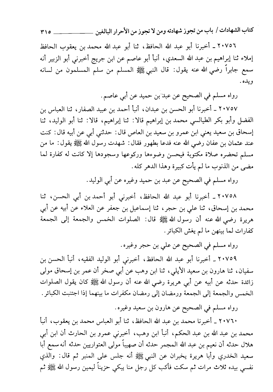 20760 - أَخْبَرَنَا مُحَمَّدُ بْنُ عَبْدِ اللهِ الْحَافِظُ , ثنا أَبُو الْعَبَّاسِ مُحَمَّدُ بْنُ يَعْقُوبَ , أنبأ مُحَمَّدُ بْنُ عَبْدِ اللهِ بْنِ عَبْدِ الْحَكَمِ , أنبأ ابْنُ وَهْبٍ , أَخْبَرَنِي عَمْرُو بْنُ الْحَارِثِ , أَنَّ ابْنَ أَبِي هِلَالٍ , حَدَّثَهُ أَنَّ نُعَيْمَ بْنَ عَبْدِ اللهِ الْمُجْمِرَ حَدَّثَهُ أَنَّ صُهَيْبًا مَوْلَى الْعُتْوَارِيِّينَ حَدَّثَهُ أَنَّهُ , سَمِعَ أَبَا سَعِيدٍ الْخُدْرِيَّ , وَأَبَا هُرَيْرَةَ يُخْبِرَانِ , عَنِ النَّبِيِّ صَلَّى اللهُ عَلَيْهِ وَسَلَّمَ أَنَّهُ جَلَسَ عَلَى الْمِنْبَرِ , ثُمَّ قَالَ: " وَالَّذِي نَفْسِي بِيَدِهِ " , ثَلَاثَ مَرَّاتٍ , ثُمَّ سَكَتَ , فَأَكَبَّ كُلُّ رَجُلٍ مِنَّا يَبْكِي حَزِينًا لِيَمِينِ رَسُولِ اللهِ صَلَّى اللهُ عَلَيْهِ وَسَلَّمَ , ثُمَّ -[316]- قَالَ: §" مَا مِنْ عَبْدٍ يَأْتِي الصَّلَوَاتِ الْخَمْسَ , وَيَصُومُ رَمَضَانَ , وَيَجْتَنِبُ الْكَبَائِرَ السَّبْعَ إِلَّا فُتِحَتْ لَهُ أَبْوَابُ الْجَنَّةِ يَوْمَ الْقِيَامَةِ , حَتَّى إِنَّهَا لَتَصْفُقُ " , ثُمَّ تَلَا: {إِنْ تَجْتَنِبُوا كَبَائِرَ مَا تُنْهَوْنَ عَنْهُ نُكَفِّرْ عَنْكُمْ سَيِّئَاتِكُمْ} [النساء: 31]. فَفِي هَذِهِ الْأَخْبَارِ وَمَا جَانَسَهَا مِنَ التَّغْلِيظِ فِي الْكَبَائِرِ وَالتَّكْفِيرِ عَنِ الصَّغَائِرِ مَا يُؤَكِّدُ قَوْلَ مَنْ فَرَّقَ بَيْنَهُمَا بِرَدِّ شَهَادَةِ مَنِ ارْتَكَبَ كَبِيرَةً دُونَ مَنِ ارْتَكَبَ صَغِيرَةً , وَمِنَ الْأَخْبَارِ الَّتِي تَدُلُّ عَلَى أَنَّ الصَّغَائِرَ إِذَا كَثُرَتْ بَلَغَتْ بِصَاحِبِهَا مَبْلَغَ مُرْتَكِبِ الْكَبِيرَةِ فِي رَدِّ الشَّهَادَةِ وَغَيْرِهِ مَا: