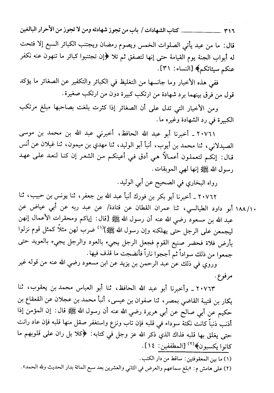 20762 - أَخْبَرَنَا أَبُو بَكْرِ بْنُ فُورَكٍ , أنبأ عَبْدُ اللهِ بْنُ جَعْفَرٍ , ثنا يُونُسُ بْنُ حَبِيبٍ , ثنا أَبُو دَاوُدَ الطَّيَالِسِيُّ , ثنا عِمْرَانُ الْقَطَّانُ , عَنْ قَتَادَةَ , عَنْ عَبْدِ رَبِّهِ , عَنْ أَبِي عِيَاضٍ , عَنْ عَبْدِ اللهِ بْنِ مَسْعُودٍ , رَضِيَ اللهُ عَنْهُ أَنَّ رَسُولَ اللهِ صَلَّى اللهُ عَلَيْهِ وَسَلَّمَ قَالَ: §" إِيَّاكُمْ وَمُحَقَّرَاتِ الْأَعْمَالِ , إِنَّهُنَّ لَيُجْمَعْنَ عَلَى الرَّجُلِ حَتَّى يُهْلِكْنَهُ " , وَإِنَّ رَسُولَ اللهِ صَلَّى اللهُ عَلَيْهِ وَسَلَّمَ ضَرَبَ لَهُنَّ مَثَلًا: " كَمَثَلِ قَوْمٍ نَزَلُوا بِأَرْضِ فَلَاةٍ , فَحَضَرَ صَنِيعُ الْقَوْمِ , فَجَعَلَ الرَّجُلُ يَجِيءُ بِالْعُودِ وَالرَّجُلُ يَجِيءُ بِالْعُوَيْدِ , حَتَّى جَمَعُوا مِنْ ذَلِكَ سَوَادًا , ثُمَّ أَجَّجُوا نَارًا فَأَنْضَجَتْ مَا قُذِفَ فِيهَا ". وَرُوِيَ فِي ذَلِكَ , عَنْ عَبْدِ الرَّحْمَنِ بْنِ يَزِيدَ , عَنِ ابْنِ مَسْعُودٍ رَضِيَ اللهُ عَنْهُ مِنْ قَوْلِهِ , غَيْرَ مَرْفُوعٍ