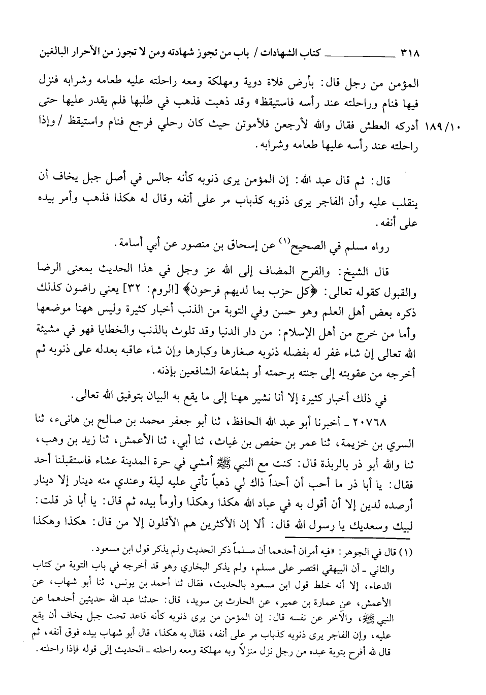 قَالَ: ثُمَّ قَالَ عَبْدُ اللهِ: §" إِنَّ الْمُؤْمِنَ يَرَى ذُنُوبَهُ كَأَنَّهُ جَالِسٌ فِي أَصْلِ جَبَلٍ , يَخَافُ أَنْ يَنْقَلِبَ عَلَيْهِ , وَإِنَّ الْفَاجِرَ يَرَى ذُنُوبَهُ كَذُبَابٍ مَرَّ عَلَى أَنْفِهِ وَقَالَ لَهُ هَكَذَا فَذَهَبَ " , وَأَمَرَّ بِيَدِهِ عَلَى أَنْفِهِ. رَوَاهُ مُسْلِمٌ فِي الصَّحِيحِ , عَنْ إِسْحَاقَ بْنِ مَنْصُورٍ , عَنْ أَبِي أُسَامَةَ قَالَ الشَّيْخُ: " وَالْفَرَحُ الْمُضَافُ إِلَى اللهِ عَزَّ وَجَلَّ فِي هَذَا الْحَدِيثِ بِمَعْنَى الرِّضَا وَالْقَبُولِ , كَقَوْلِهِ تَعَالَى: {كُلُّ حِزْبٍ بِمَا لَدَيْهِمْ فَرِحُونَ} [المؤمنون: 53] يَعْنِي: رَاضُونَ , كَذَلِكَ ذَكَرَهُ بَعْضُ أَهْلِ الْعِلْمِ وَهُوَ حَسَنٌ وَفِي التَّوْبَةِ مِنَ الذَّنْبِ أَخْبَارٌ كَثِيرَةٌ , وَلَيْسَ هَهُنَا مَوْضِعُهَا , وَأَمَّا مَنْ خَرَجَ مِنْ أَهْلِ الْإِسْلَامِ مِنْ دَارِ الدُّنْيَا , وَقَدْ تَلَوَّثَ بِالذَّنْبِ وَالْخَطَايَا فَهُوَ فِي مَشِيئَةِ اللهِ تَعَالَى , إِنْ شَاءَ غَفَرَ لَهُ بِفَضْلِهِ ذُنُوبَهُ صِغَارَهَا وَكِبَارَهَا , وَإِنْ شَاءَ عَاقَبَهُ بِعَدْلِهِ عَلَى ذُنُوبِهِ , ثُمَّ أَخْرَجَهُ مِنْ عُقُوبَتِهِ إِلَى جَنَّتِهِ بِرَحْمَتِهِ أَوْ بِشَفَاعَةِ الشَّافِعِينَ بِإِذْنِهِ , فِي ذَلِكَ أَخْبَارٌ كَثِيرَةٌ إِلَّا أَنَّا نُشِيرُ هَهُنَا إِلَى مَا يَقَعُ بِهِ الْبَيَانُ بِتَوْفِيقِ اللهِ تَعَالَى